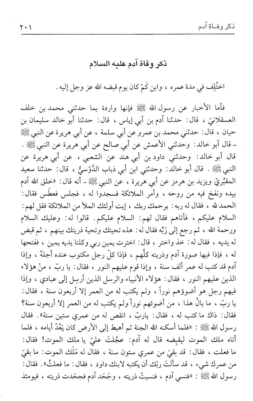 فأما الأخبار عن رسول الله - صلى الله عليه وسلم - فإنها واردة بما حدثني محمد بن خلف العسقلانيّ، قال: حدثنا آدم بن أبي إياس، قال: حدثنا أبو خالد سليمان بن حيان، قال: حدثني محمد بن عمرو عن أبي سلمة، عن أبي هريرة عن النبي - صلى الله عليه وسلم - قال أبو خالد: وحدثني الأعمش عن أبي صالح عن أبي هريرة عن النبي - صلى الله عليه وسلم -. قال أبو خالد: وحدثني داود بن أبي هند عن الشعبي، عن أبي هريرة عن النبي - صلى الله عليه وسلم -. قال أبو خالد: وحدثني ابن أبي ذباب الدَّوْسيُّ، قال: حدثنا سعيد المقبُريّ ويزيد بن هرمز عن أبي هريرة، عن النبي - صلى الله عليه وسلم - أنه قال: "خلق الله آدم بيده ونفخ فيه من روحه، وأمر الملائكة فسجدوا له، فجلس فعطَس فقال: الحمد لله، فقال له ربه: يرحمك ربك، إيت أولئك الملأ من الملائكة فقل لهم: السلام عليكم، فأتاهم فقال لهم: السلام عليكم. قالوا له: وعليك السلام ورحمة الله، ثم رجع إلى رَبِّه فقال له: هذه تحيتك وتحية ذريتك بينهم، ثم قبض له يديه، فقال له: خذ واختر، قال: اخترت يمين ربي وكلتا يديه يمين، ففتحها له، فإذا فيها صورة آدم وذريته كلَّهم، فإذا كلّ رجل مكتوب عنده أجلهُ، وإذا آدم قد كتب له عمر ألف سنة، وإذا قوم عليهم النور، فقال: يا ربّ، منْ هؤلاء الذين عليهم النور، فقال: هؤلاء الأنبياء والرسل الذين أرسِل إلى عبادي، وإذا فيهم رجل هو أضوؤهم نورًا، ولم يكتب له من العمر إلا أربعون سنة، فقال: يا ربّ، ما بالُ هذا، من أضوئهم نورًا ولم يكتب له من العمر إلا أربعون سنة؟ فقال: ذاك ما كتب له، فقال: ياربّ، انقص له من عمري ستين سنة". فقال رسول الله - صلى الله عليه وسلم -: "فلما أسكنه الله الجنة ثم أهبط إلى الأرض كان يَعُدّ أيامه، فلما أتاه ملك الموت ليقبِضه قال له آدم: عجَّلتَ عليّ يا ملك الموت! فقال: ما فعلت، فقال: قد بقيَ من عمري ستون سنة، فقال له مَلَك الموت: ما بقيَ من عمرك شيء، قد سألتَ ربّك أن يكتبه لابنك داود، فقال: ما فعلتُ". فقال: رسول الله - صلى الله عليه وسلم -: "فنسي آدم، فنسيتْ ذريته، وجَحَد آدم فجحَدت ذريته، فيومئذ