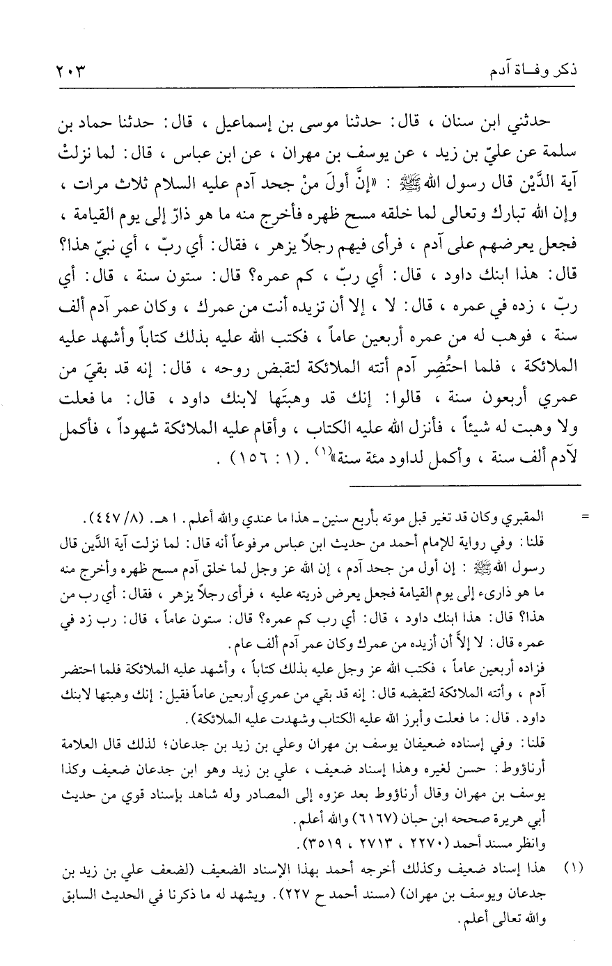حدثني ابن سنان، قال: حدثنا موسى بن إسماعيل، قال: حدثنا حماد بن سلمة عن عليّ بن زيد، عن يوسف بن مهران، عن ابن عباس، قال: لما نزلتْ آية الدَّين قال رسول الله - صلى الله عليه وسلم -: "إنَّ أولَ منْ جحد آدم - عليه السلام - ثلاث مرات، وإن الله تبارك وتعالى لما خلقه مسح ظهره فأخرج منه ما هو ذارّ إلى يوم القيامة، فجعل يعرضهم على آدم، فرأى فيهم رجلًا يزهر، فقال: أي ربّ، أي نبيّ هذا؟ قال: هذا ابنك داود، قال: أي ربّ، كم عمره؟ قال: ستون سنة، قال: أي ربّ، زده في عمره، قال: لا، إلا أن تزيده أنت من عمرك، وكان عمر آدم ألف سنة، فوهب له من عمره أربعين عامًا، فكتب الله عليه بذلك كتابًا وأشهد عليه الملائكة، فلما احتُضِر آدم أتته الملائكة لتقبض روحه، قال: إنه قد بقيَ من عمري أربعون سنة، قالوا: إنك قد وهبتَها لابنك داود، قال: ما فعلت ولا وهبت له شيئًا، فأنزل الله عليه الكتاب، وأقام عليه الملائكة شهودًا، فأكمل لآدم ألف سنة، وأكمل لداود مئة سنة" (١). (١: ١٥٦).