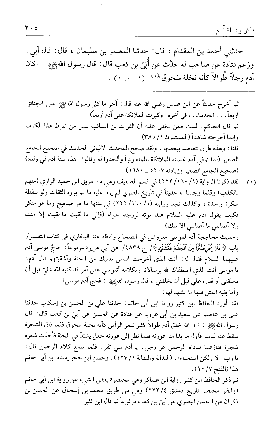 (١) لقد ذكرنا الرواية (١/ ١٦٠ / ٢٢٢) في قسم الضعيف وهي من طريق ابن حميد الرازي (متهم بالكذب) وقلما وجدنا له حديثًا في تأريخ الطبري لم يزد عليه ما لم يروه الثقات ولو بلفظة منكرة واحدة، وكذلك نجد روايته (١/ ١٦٠ / ٢٢٢) في متنها ما هو صحيح وما هو منكر فكيف يقول آدم - عليه السلام - عند موته لزوجته حواء (فإني ما لقيت ما لقيت إلا منك ولا أصابني ما أصابني إلا منك).