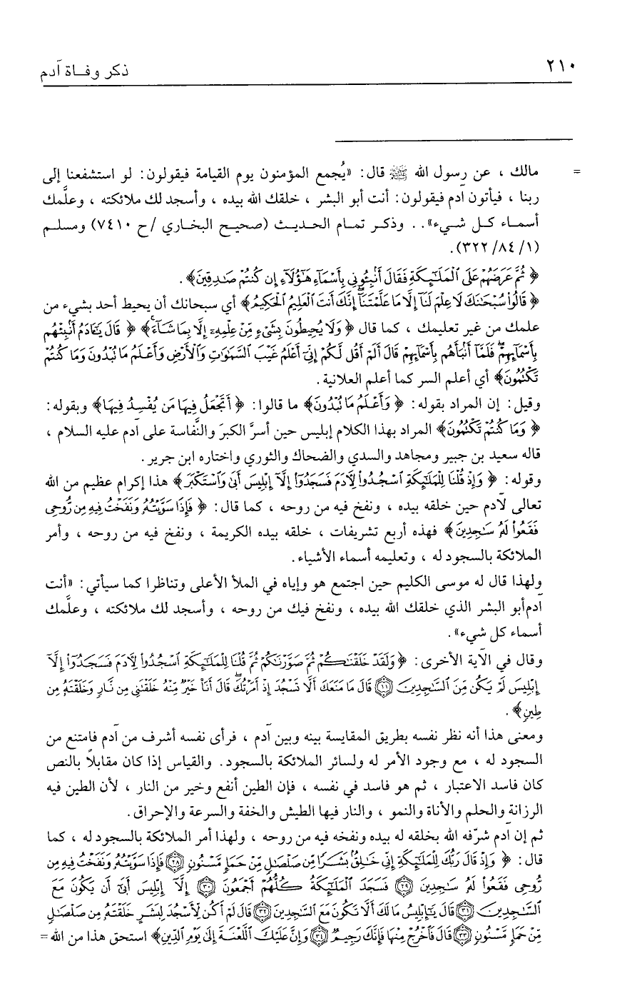 = مالك، عن رسول الله - صلى الله عليه وسلم - قال: "يُجمع المؤمنون يوم القيامة فيقولون: لو استشفعنا إلى ربنا، فيأتون آدم فيقولون: أنت أبو البشر، خلقك الله بيده، وأسجد لك ملائكته، وعلَّمك أسماء كل شيء" .. وذكر تمام الحديث (صحيح البخاري / ح ٧٤١٠) ومسلم (١/ ٨٤ / ٣٢٢).
