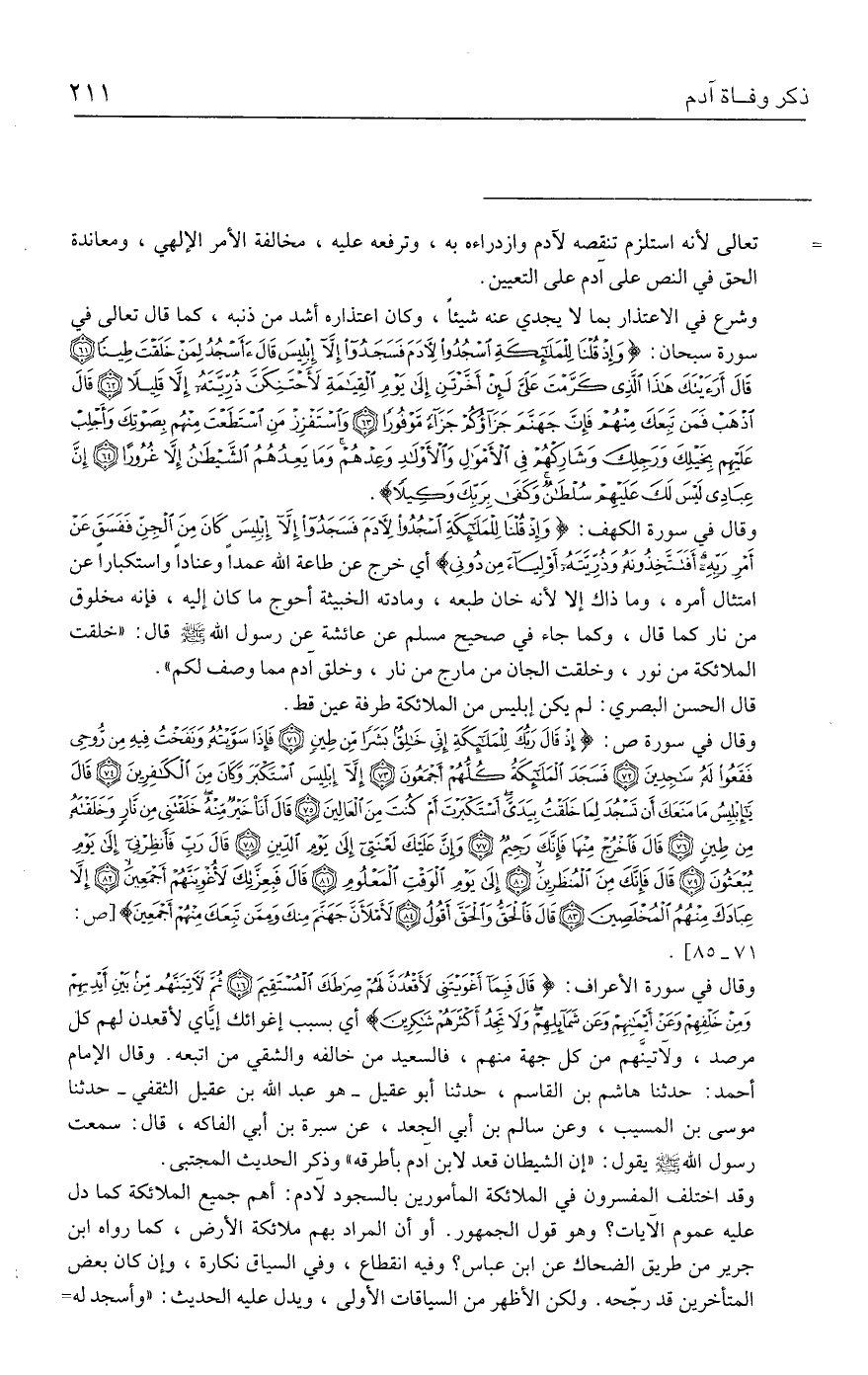 وقال في سورة ص: {إِذْ قَال رَبُّكَ لِلْمَلَائِكَةِ إِنِّي خَالِقٌ بَشَرًا مِنْ طِينٍ (٧١) فَإِذَا سَوَّيتُهُ وَنَفَخْتُ فِيهِ مِنْ رُوحِي فَقَعُوا لَهُ سَاجِدِينَ (٧٢) فَسَجَدَ الْمَلَائِكَةُ كُلُّهُمْ أَجْمَعُونَ (٧٣) إلا إِبْلِيسَ اسْتَكْبَرَ وَكَانَ مِنَ الْكَافِرِينَ (٧٤) قَال يَاإِبْلِيسُ مَا مَنَعَكَ أَنْ تَسْجُدَ لِمَا خَلَقْتُ بِيَدَيَّ أَسْتَكْبَرْتَ أَمْ كُنْتَ مِنَ الْعَالِينَ (٧٥) قَال أَنَا خَيرٌ مِنْهُ خَلَقْتَنِي مِنْ نَارٍ وَخَلَقْتَهُ مِنْ طِينٍ (٧٦) قَال فَاخْرُجْ مِنْهَا فَإِنَّكَ رَجِيمٌ (٧٧) وَإِنَّ عَلَيكَ لَعْنَتِي إِلَى يَوْمِ الدِّينِ (٧٨) قَال رَبِّ فَأَنْظِرْنِي إِلَى يَوْمِ يُبْعَثُونَ (٧٩) قَال فَإِنَّكَ مِنَ الْمُنْظَرِينَ (٨٠) إِلَى يَوْمِ الْوَقْتِ الْمَعْلُومِ (٨١) قَال فَبِعِزَّتِكَ لَأُغْويَنَّهُمْ أَجْمَعِينَ (٨٢) إلا عِبَادَكَ مِنْهُمُ الْمُخْلَصِينَ (٨٣) قَال فَالْحَقُّ وَالْحَقَّ أَقُولُ (٨٤) لَأَمْلَأَنَّ جَهَنَّمَ مِنْكَ وَمِمَّنْ تَبِعَكَ مِنْهُمْ أَجْمَعِينَ} [ص: ٧١ - ٨٥].