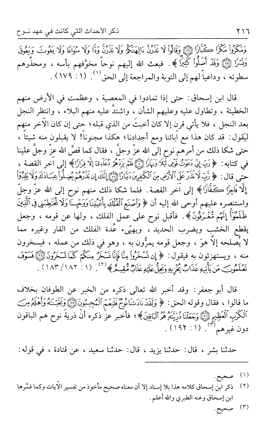 قال أبو جعفر: وقد أخبر الله تعالى ذكره من الخبر عن الطوفان بخلاف ما قالوا، فقال وقوله الحق: {وَلَقَدْ نَادَانَا نُوحٌ فَلَنِعْمَ الْمُجِيبُونَ (٧٥) وَنَجَّينَاهُ وَأَهْلَهُ مِنَ الْكَرْبِ الْعَظِيمِ (٧٦) وَجَعَلْنَا ذُرِّيَّتَهُ هُمُ الْبَاقِينَ}؛ فأخبر عزّ ذكره أنّ ذريةَ نوح هم الباقون دون غيرهم (٣). (١٩٢: ١).