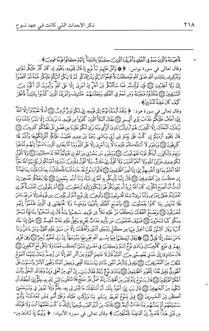 وقال تعالى في سورة هود: {وَلَقَدْ أَرْسَلْنَا نُوحًا إِلَى قَوْمِهِ إِنِّي لَكُمْ نَذِيرٌ مُبِينٌ (٢٥) أَنْ لَا تَعْبُدُوا إلا اللَّهَ إِنِّي أَخَافُ عَلَيكُمْ عَذَابَ يَوْمٍ أَلِيمٍ (٢٦) فَقَال الْمَلَأُ الَّذِينَ كَفَرُوا مِنْ قَوْمِهِ مَا نَرَاكَ إلا بَشَرًا مِثْلَنَا وَمَا نَرَاكَ اتَّبَعَكَ إلا الَّذِينَ هُمْ أَرَاذِلُنَا بَادِيَ الرَّأْيِ وَمَا نَرَى لَكُمْ عَلَينَا مِنْ فَضْلٍ بَلْ نَظُنُّكُمْ كَاذِبِينَ (٢٧) قَال يَاقَوْمِ أَرَأَيتُمْ إِنْ كُنْتُ عَلَى بَيِّنَةٍ مِنْ رَبِّي وَآتَانِي رَحْمَةً مِنْ عِنْدِهِ فَعُمِّيَتْ عَلَيكُمْ أَنُلْزِمُكُمُوهَا وَأَنْتُمْ لَهَا كَارِهُونَ (٢٨) وَيَاقَوْمِ لَا أَسْأَلُكُمْ عَلَيهِ مَالًا إِنْ أَجْرِيَ إلا عَلَى اللَّهِ وَمَا أَنَا بِطَارِدِ الَّذِينَ آمَنُوا إِنَّهُمْ مُلَاقُو رَبِّهِمْ وَلَكِنِّي أَرَاكُمْ قَوْمًا تَجْهَلُونَ (٢٩) وَيَاقَوْمِ مَنْ يَنْصُرُنِي مِنَ اللَّهِ إِنْ طَرَدْتُهُمْ أَفَلَا تَذَكَّرُونَ (٣٠) وَلَا أَقُولُ لَكُمْ عِنْدِي خَزَائِنُ اللَّهِ وَلَا أَعْلَمُ الْغَيبَ وَلَا أَقُولُ إِنِّي مَلَكٌ وَلَا أَقُولُ لِلَّذِينَ تَزْدَرِي أَعْيُنُكُمْ لَنْ يُؤْتِيَهُمُ اللَّهُ خَيرًا اللَّهُ أَعْلَمُ بِمَا فِي أَنْفُسِهِمْ إِنِّي إِذًا لَمِنَ الظَّالِمِينَ (٣١) قَالُوا يَانُوحُ قَدْ جَادَلْتَنَا فَأَكْثَرْتَ جِدَالنَا فَأْتِنَا بِمَا تَعِدُنَا إِنْ كُنْتَ مِنَ الصَّادِقِينَ (٣٢) قَال إِنَّمَا يَأْتِيكُمْ بِهِ اللَّهُ إِنْ شَاءَ وَمَا أَنْتُمْ بِمُعْجِزِينَ (٣٣) وَلَا يَنْفَعُكُمْ نُصْحِي إِنْ أَرَدْتُ أَنْ أَنْصَحَ لَكُمْ إِنْ كَانَ اللَّهُ يُرِيدُ أَنْ يُغْويَكُمْ هُوَ رَبُّكُمْ وَإِلَيهِ تُرْجَعُونَ (٣٤) أَمْ يَقُولُونَ افْتَرَاهُ قُلْ إِنِ افْتَرَيتُهُ فَعَلَيَّ إِجْرَامِي وَأَنَا بَرِيءٌ مِمَّا تُجْرِمُونَ (٣٥) وَأُوحِيَ إِلَى نُوحٍ أَنَّهُ لَنْ يُؤْمِنَ مِنْ قَوْمِكَ إلا مَنْ قَدْ آمَنَ فَلَا تَبْتَئِسْ بِمَا كَانُوا يَفْعَلُونَ (٣٦) وَاصْنَعِ الْفُلْكَ بِأَعْيُنِنَا وَوَحْيِنَا وَلَا تُخَاطِبْنِي فِي الَّذِينَ ظَلَمُوا إِنَّهُمْ مُغْرَقُونَ (٣٧) وَيَصْنَعُ الْفُلْكَ وَكُلَّمَا مَرَّ عَلَيهِ مَلَأٌ مِنْ قَوْمِهِ سَخِرُوا مِنْهُ قَال إِنْ تَسْخَرُوا مِنَّا فَإِنَّا نَسْخَرُ مِنْكُمْ كَمَا تَسْخَرُونَ (٣٨) فَسَوْفَ تَعْلَمُونَ مَنْ يَأْتِيهِ عَذَابٌ يُخْزِيهِ وَيَحِلُّ عَلَيهِ عَذَابٌ مُقِيمٌ (٣٩) حَتَّى إِذَا جَاءَ أَمْرُنَا وَفَارَ التَّنُّورُ قُلْنَا احْمِلْ فِيهَا مِنْ كُلٍّ زَوْجَينِ اثْنَينِ وَأَهْلَكَ إلا مَنْ سَبَقَ عَلَيهِ الْقَوْلُ وَمَنْ آمَنَ وَمَا آمَنَ مَعَهُ إلا قَلِيلٌ (٤٠) وَقَال ارْكَبُوا فِيهَا بِسْمِ اللَّهِ مَجْرَاهَا وَمُرْسَاهَا إِنَّ رَبِّي لَغَفُورٌ رَحِيمٌ (٤١) وَهِيَ تَجْرِي بِهِمْ فِي مَوْجٍ كَالْجِبَالِ وَنَادَى نُوحٌ ابْنَهُ وَكَانَ فِي مَعْزِلٍ يَابُنَيَّ ارْكَبْ مَعَنَا وَلَا تَكُنْ مَعَ الْكَافِرِينَ (٤٢) قَال سَآوي إِلَى جَبَلٍ يَعْصِمُنِي مِنَ الْمَاءِ قَال لَا عَاصِمَ الْيَوْمَ مِنْ أَمْرِ اللَّهِ إلا مَنْ رَحِمَ وَحَال بَينَهُمَا الْمَوْجُ فَكَانَ مِنَ الْمُغْرَقِينَ (٤٣) وَقِيلَ يَاأَرْضُ ابْلَعِي مَاءَكِ وَيَاسَمَاءُ أَقْلِعِي وَغِيضَ الْمَاءُ وَقُضِيَ الْأَمْرُ وَاسْتَوَتْ عَلَى الْجُودِيِّ وَقِيلَ بُعْدًا لِلْقَوْمِ الظَّالِمِينَ (٤٤) وَنَادَى نُوحٌ رَبَّهُ فَقَال رَبِّ إِنَّ ابْنِي مِنْ أَهْلِي وَإِنَّ وَعْدَكَ الْحَقُّ وَأَنْتَ أَحْكَمُ الْحَاكِمِينَ (٤٥) قَال يَانُوحُ إِنَّهُ لَيسَ مِنْ أَهْلِكَ إِنَّهُ عَمَلٌ غَيرُ صَالِحٍ فَلَا تَسْأَلْنِ مَا لَيسَ لَكَ بِهِ عِلْمٌ إِنِّي أَعِظُكَ أَنْ تَكُونَ مِنَ الْجَاهِلِينَ (٤٦) قَال رَبِّ إِنِّي أَعُوذُ بِكَ أَنْ أَسْأَلَكَ مَا لَ
