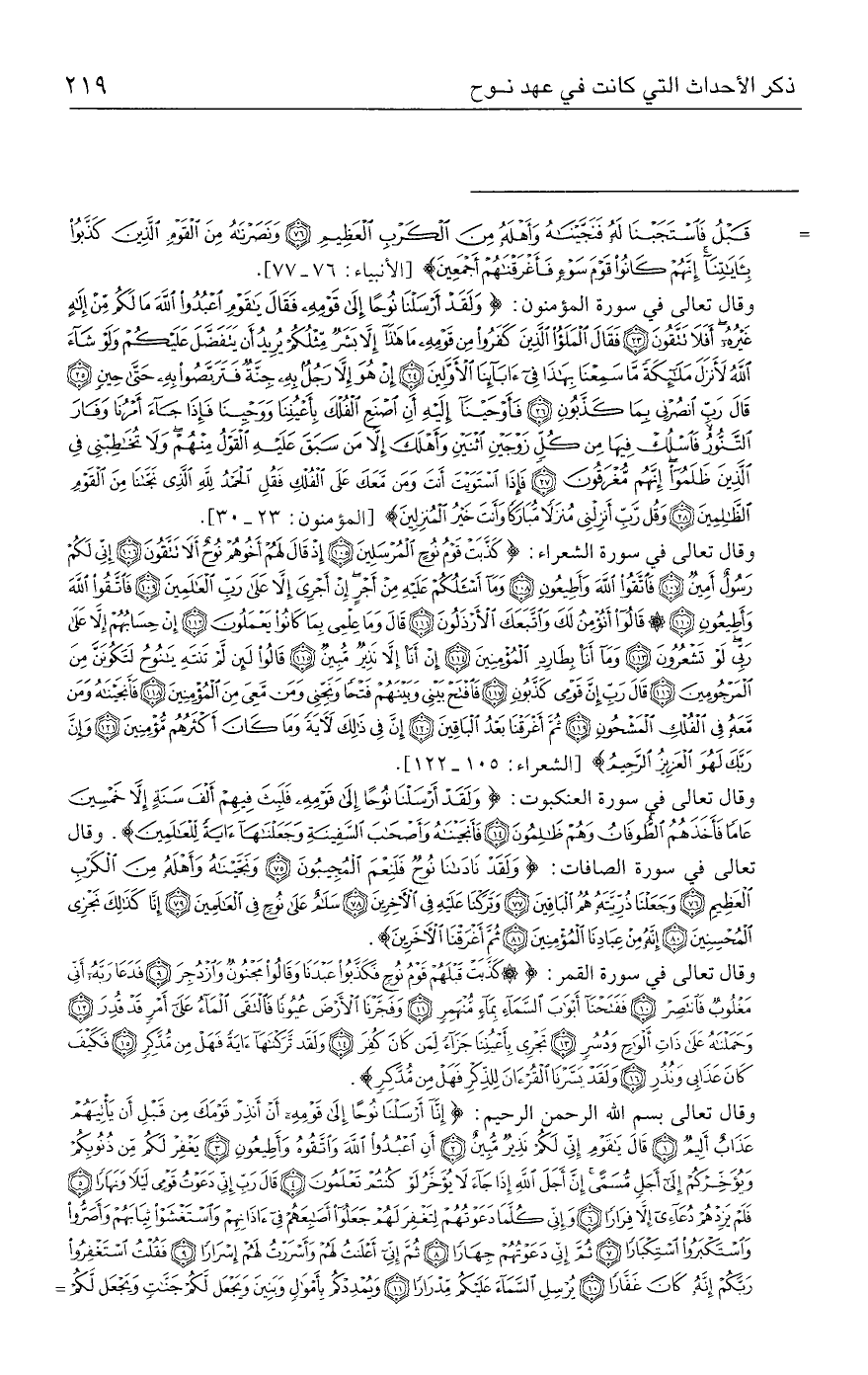 وقال تعالى في سورة العنكبوت: {وَلَقَدْ أَرْسَلْنَا نُوحًا إِلَى قَوْمِهِ فَلَبِثَ فِيهِمْ أَلْفَ سَنَةٍ إلا خَمْسِينَ عَامًا فَأَخَذَهُمُ الطُّوفَانُ وَهُمْ ظَالِمُونَ (١٤) فَأَنْجَينَاهُ وَأَصْحَابَ السَّفِينَةِ وَجَعَلْنَاهَا آيَةً لِلْعَالمِينَ}. وقال تعالى في سورة الصافات: {وَلَقَدْ نَادَانَا نُوحٌ فَلَنِعْمَ الْمُجِيبُونَ (٧٥) وَنَجَّينَاهُ وَأَهْلَهُ مِنَ الْكَرْبِ الْعَظِيمِ (٧٦) وَجَعَلْنَا ذُرِّيَّتَهُ هُمُ الْبَاقِينَ (٧٧) وَتَرَكْنَا عَلَيهِ فِي الْآخِرِينَ (٧٨) سَلَامٌ عَلَى نُوحٍ فِي الْعَالمِينَ (٧٩) إِنَّا كَذَلِكَ نَجْزِي الْمُحْسِنِينَ (٨٠) إِنَّهُ مِنْ عِبَادِنَا الْمُؤْمِنِينَ (٨١) ثُمَّ أَغْرَقْنَا الْآخَرِينَ}.