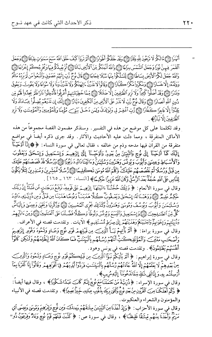 وقد تكلمنا على كل موضع من هذه في التفسير. وسنذكر مضمون القصة مجموعًا من هذه الأماكن المتفرقة، ومما دلت عليه الأحاديث والآثار. وقد جرى ذكره أيضًا في مواضع متفرقة من القرآن فيها مدحه وذم من خالفه، فقال تعالى في سورة النساء: {إِنَّا أَوْحَينَا إِلَيكَ كَمَا أَوْحَينَا إِلَى نُوحٍ وَالنَّبِيِّينَ مِنْ بَعْدِهِ وَأَوْحَينَا إِلَى إِبْرَاهِيمَ وَإِسْمَاعِيلَ وَإِسْحَاقَ وَيَعْقُوبَ وَالْأَسْبَاطِ وَعِيسَى وَأَيُّوبَ وَيُونُسَ وَهَارُونَ وَسُلَيمَانَ وَآتَينَا دَاوُودَ زَبُورًا (١٦٣) وَرُسُلًا قَدْ قَصَصْنَاهُمْ عَلَيكَ مِنْ قَبْلُ وَرُسُلًا لَمْ نَقْصُصْهُمْ عَلَيكَ وَكَلَّمَ اللَّهُ مُوسَى تَكْلِيمًا (١٦٤) رُسُلًا مُبَشِّرِينَ وَمُنْذِرِينَ لِئَلَّا يَكُونَ لِلنَّاسِ عَلَى اللَّهِ حُجَّةٌ بَعْدَ الرُّسُلِ وَكَانَ اللَّهُ عَزِيزًا حَكِيمًا} [النساء: ١٦٣ - ١٦٥].
