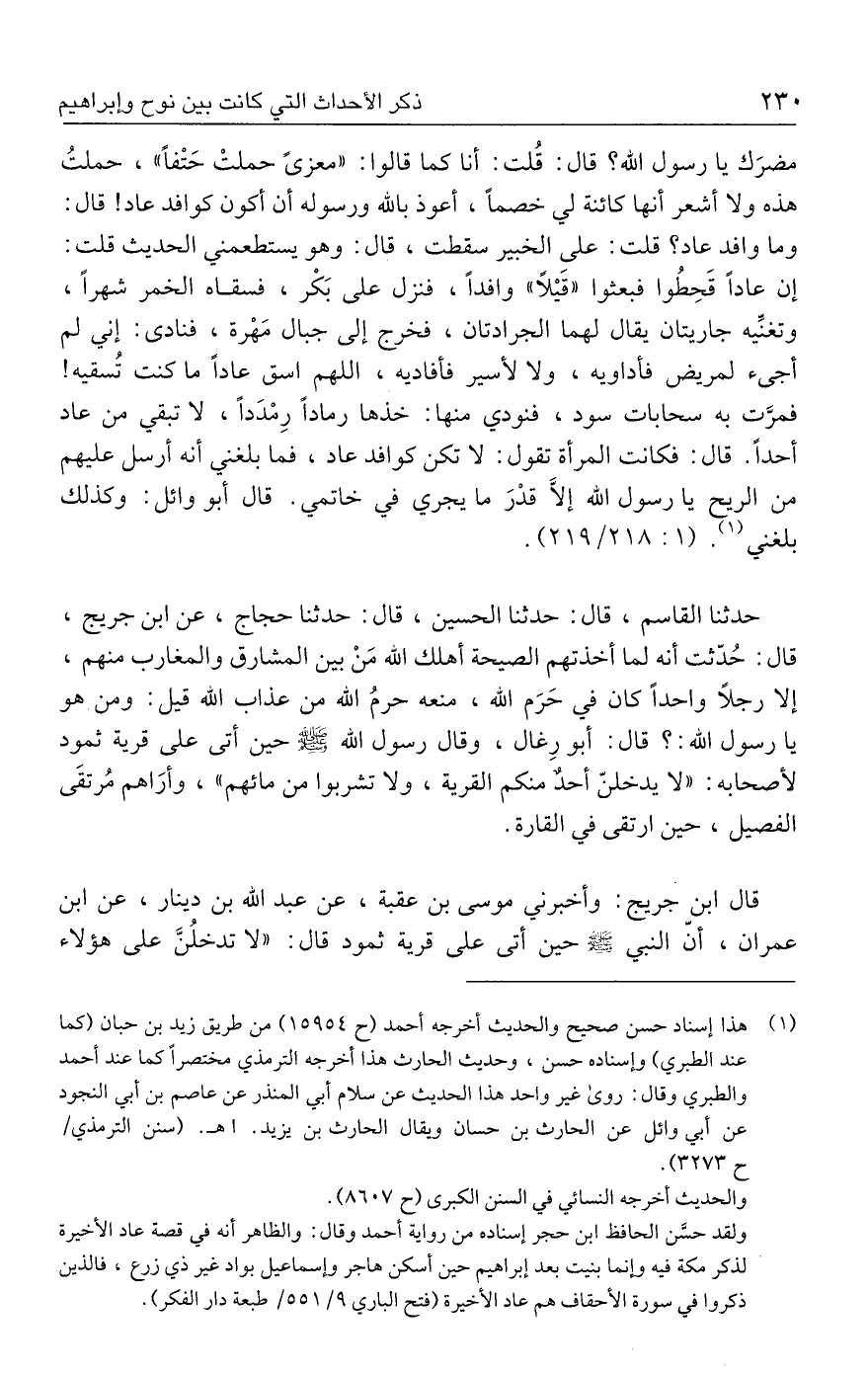 قال ابن جريج: وأخبرني موسى بن عقبة، عن عبد الله بن دينار، عن ابن عمران، أنّ النبي - صلى الله عليه وسلم - حين أتى على قرية ثمود قال: "لا تدخلُنَّ على هؤلاء