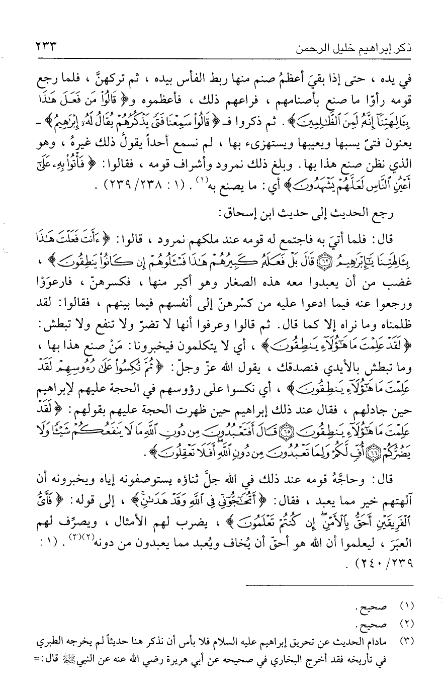 (٣) ما دام الحديث عن تحريق إبراهيم - عليه السلام - فلا بأس أن نذكر هنا حديثًا لم يخرجه الطبري في تأريخه فقد أخرج البخاري في صحيحه عن أبي هريرة - رضي الله عنه - عن النبي - صلى الله عليه وسلم - قال: =