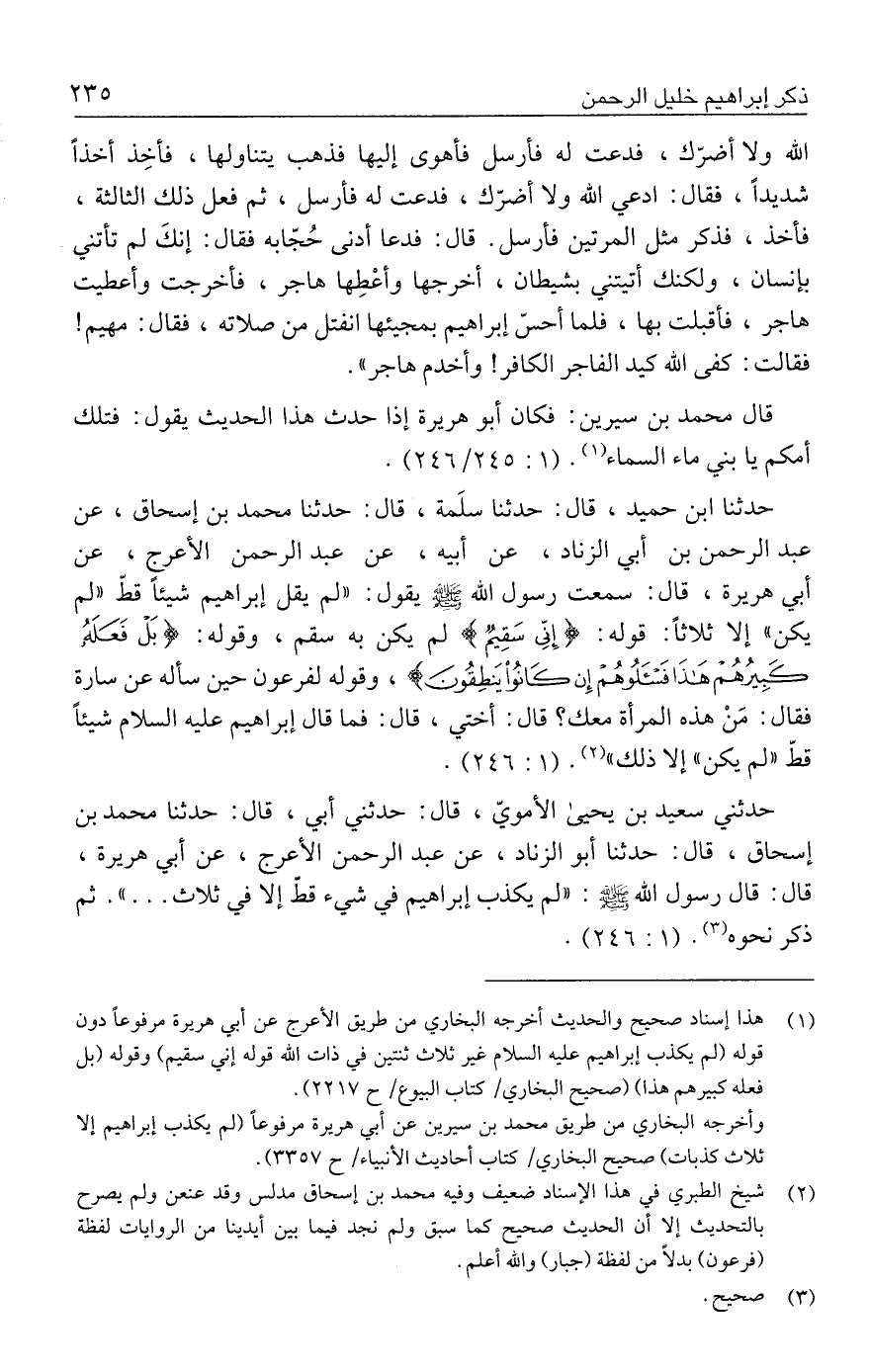 حدثنا ابن حميد، قال: حدثنا سلَمة، قال: حدثنا محمد بن إسحاق، عن عبد الرحمن بن أبي الزناد، عن أبيه، عن عبد الرحمن الأعرج، عن أبي هريرة، قال: سمعت رسول الله - صلى الله عليه وسلم - يقول: "لم يقل إبراهيم شيئًا قطّ "لم يكن" إلا ثلاثًا: قوله: {إِنِّي سَقِيمٌ} لم يكن به سقم، وقوله: {بَلْ فَعَلَهُ كَبِيرُهُمْ هَذَا فَاسْأَلُوهُمْ إِنْ كَانُوا يَنْطِقُونَ}، وقوله لفرعون حين سأله عن سارة فقال: مَنْ هذه المرأة معك؟ قال: أختي، قال: فما قال إبراهيم - عليه السلام - شيئًا قطّ "لم يكن" إلا ذلك" (٢). (١: ٢٤٦).