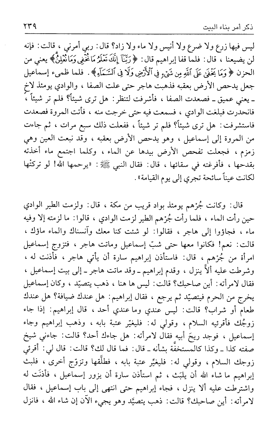 ليس فيها زرع ولا ضرع ولا أنيس ولا ماء ولا زاد؟ قال: ربي أمرني، قالت: فإنه لن يضيعنا، قال: فلما قفا إبراهيم قال: {رَبَّنَا إِنَّكَ تَعْلَمُ مَا نُخْفِي وَمَا نُعْلِنُ} يعني من الحزن {وَمَا يَخْفَى عَلَى اللَّهِ مِنْ شَيءٍ فِي الْأَرْضِ وَلَا فِي السَّمَاءِ}. فلما ظمئ إسماعيل جعل يدحص الأرض بعقبه فذهبت هاجر حتى علت الصفا، والوادي يومئذ لاخٍ -يعني عميق- فصعدت الصفا، فأشرفت لتنظر: هل ترى شيئًا؟ فلم تر شيئًا، فانحدرت فبلغت الوادي، فسمعت فيه حتى خرجت منه، فأتت المروة فصعدت فاستشرفت: هل ترى شيئًا؟ فلم تر شيئًا، ففعلت ذلك سبع مرات، ثم جاءت من المروة إلى إسماعيل، وهو يدحص الأرض بعقبه، وقد نبعت العين وهي زمزم، فجعلت تفحص الأرض بيدها عن الماء، وكلما اجتمع ماء أخذته بقدحها، فأفرغته في سقائها، قال: فقال النبي - صلى الله عليه وسلم -: "يرحمها الله! لو تركتْها لكانت عينًا سائحة تجري إلى يوم القيامة".