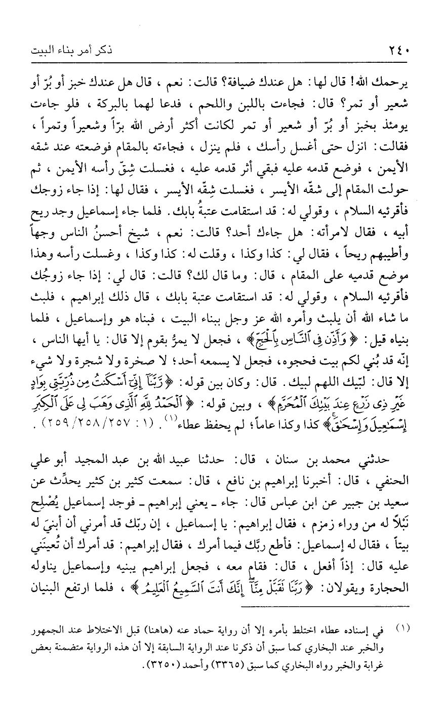 يرحمك الله! قال لها: هل عندك ضيافة؟ قالت: نعم، قال هل عندك خبز أو بُرّ أو شعير أو تمر؟ قال: فجاءت باللبن واللحم، فدعا لهما بالبركة، فلو جاءت يومئذ بخبز أو بُرّ أو شعير أو تمر لكانت أكثر أرض الله برًّا وشعيرًا وتمرًا، فقالت: انزل حتى أغسل رأسك، فلم ينزل، فجاءته بالمقام فوضعته عند شقه الأيمن، فوضع قدمه عليه فبقي أثر قدمه عليه، فغسلت شِقّ رأسه الأيمن، ثم حولت المقام إلى شقّه الأيسر، فغسلت شِقّه الأيسر، فقال لها: إذا جاء زوجك فأقرئيه السلام، وقولي له: قد استقامت عتبةُ بابك. فلما جاء إسماعيل وجد ريح أبيه، فقال لامرأته: هل جاءك أحد؟ قالت: نعم، شيخ أحسنُ الناس وجهًا وأطيبهم ريحًا، فقال لي: كذا وكذا، وقلت له: كذا وكذا، وغسلت رأسه وهذا موضع قدميه على المقام، قال: وما قال لك؟ قالت: قال لي: إذا جاء زوجُك فأقرئيه السلام، وقولي له: قد استقامت عتبة بابك، قال ذلك إبراهيم، فلبث ما شاء الله أن يلبث وأمره الله عزَّ وجلَّ ببناء البيت، فبناه هو وإسماعيل، فلما بنياه قيل: {وَأَذِّنْ فِي النَّاسِ بِالْحَجِّ}، فجعل لا يمرُّ بقوم إلا قال: يا أيها الناس، إنّه قد بُني لكم بيت فحجوه، فجعل لا يسمعه أحد؛ لا صخرة ولا شجرة ولا شيء إلا قال: لبّيك اللهم لبيك. قال: وكان بين قوله: {رَبَّنَا إِنِّي أَسْكَنْتُ مِنْ ذُرِّيَّتِي بِوَادٍ غَيرِ ذِي زَرْعٍ عِنْدَ بَيتِكَ الْمُحَرَّمِ}، وبين قوله: {الْحَمْدُ لِلَّهِ الَّذِي وَهَبَ لِي عَلَى الْكِبَرِ إِسْمَاعِيلَ وَإِسْحَاقَ} كذا وكذا عامًا؛ لم يحفظ عطاء (١). (١: ٢٥٧/ ٢٥٨ / ٢٥٩).