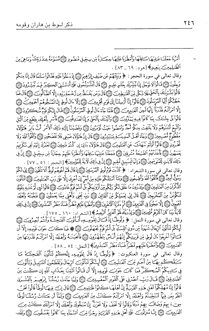 وقال تعالى في سورة الشعراء: {كَذَّبَتْ قَوْمُ لُوطٍ الْمُرْسَلِينَ (١٦٠) إِذْ قَال لَهُمْ أَخُوهُمْ لُوطٌ أَلَا تَتَّقُونَ (١٦١) إِنِّي لَكُمْ رَسُولٌ أَمِينٌ (١٦٢) فَاتَّقُوا اللَّهَ وَأَطِيعُونِ (١٦٣) وَمَا أَسْأَلُكُمْ عَلَيهِ مِنْ أَجْرٍ إِنْ أَجْرِيَ إلا عَلَى رَبِّ الْعَالمِينَ (١٦٤) أَتَأْتُونَ الذُّكْرَانَ مِنَ الْعَالمِينَ (١٦٥) وَتَذَرُونَ مَا خَلَقَ لَكُمْ رَبُّكُمْ مِنْ أَزْوَاجِكُمْ بَلْ أَنْتُمْ قَوْمٌ عَادُونَ (١٦٦) قَالُوا لَئِنْ لَمْ تَنْتَهِ يَالُوطُ لَتَكُونَنَّ مِنَ الْمُخْرَجِينَ (١٦٧) قَال إِنِّي لِعَمَلِكُمْ مِنَ الْقَالِينَ (١٦٨) رَبِّ نَجِّنِي وَأَهْلِي مِمَّا يَعْمَلُونَ (١٦٩) فَنَجَّينَاهُ وَأَهْلَهُ أَجْمَعِينَ (١٧٠) إلا عَجُوزًا فِي الْغَابِرِينَ (١٧١) ثُمَّ دَمَّرْنَا الْآخَرِينَ (١٧٢) وَأَمْطَرْنَا عَلَيهِمْ مَطَرًا فَسَاءَ مَطَرُ الْمُنْذَرِينَ (١٧٣) إِنَّ فِي ذَلِكَ لآيَةً وَمَا كَانَ أَكْثَرُهُمْ مُؤْمِنِينَ (١٧٤) وَإِنَّ رَبَّكَ لَهُوَ الْعَزِيزُ الرَّحِيمُ} [الشعراء: ١٦٠ - ١٧٥].