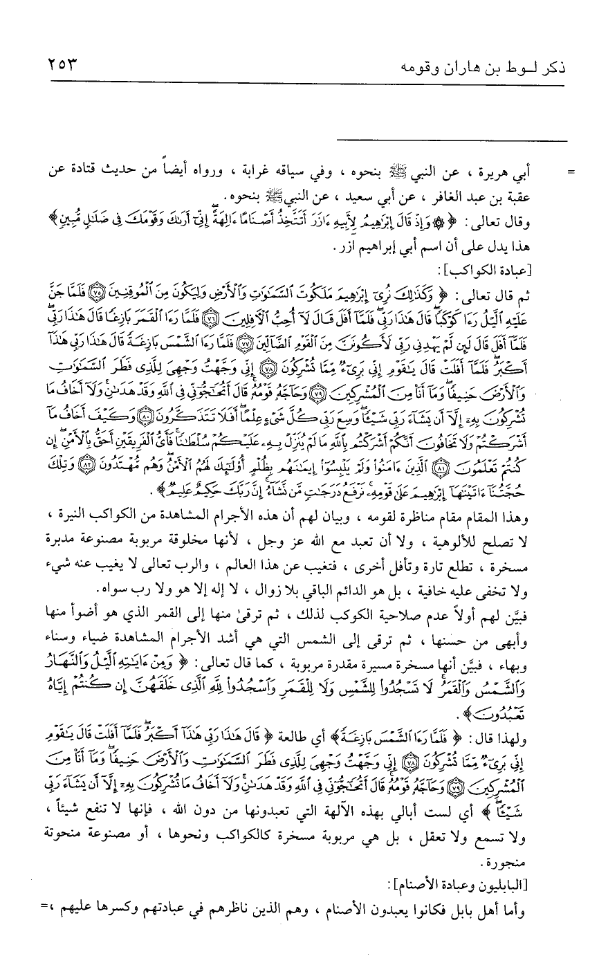 ثم قال تعالى: {وَكَذَلِكَ نُرِي إِبْرَاهِيمَ مَلَكُوتَ السَّمَاوَاتِ وَالْأَرْضِ وَلِيَكُونَ مِنَ الْمُوقِنِينَ (٧٥) فَلَمَّا جَنَّ عَلَيهِ اللَّيلُ رَأَى كَوْكَبًا قَال هَذَا رَبِّي فَلَمَّا أَفَلَ قَال لَا أُحِبُّ الْآفِلِينَ (٧٦) فَلَمَّا رَأَى الْقَمَرَ بَازِغًا قَال هَذَا رَبِّي فَلَمَّا أَفَلَ قَال لَئِنْ لَمْ يَهْدِنِي رَبِّي لَأَكُونَنَّ مِنَ الْقَوْمِ الضَّالِّينَ (٧٧) فَلَمَّا رَأَى الشَّمْسَ بَازِغَةً قَال هَذَا رَبِّي هَذَا أَكْبَرُ فَلَمَّا أَفَلَتْ قَال يَاقَوْمِ إِنِّي بَرِيءٌ مِمَّا تُشْرِكُونَ (٧٨) إِنِّي وَجَّهْتُ وَجْهِيَ لِلَّذِي فَطَرَ السَّمَاوَاتِ وَالْأَرْضَ حَنِيفًا وَمَا أَنَا مِنَ الْمُشْرِكِينَ (٧٩) وَحَاجَّهُ قَوْمُهُ قَال أَتُحَاجُّونِّي فِي اللَّهِ وَقَدْ هَدَانِ وَلَا أَخَافُ مَا تُشْرِكُونَ بِهِ إلا أَنْ يَشَاءَ رَبِّي شَيئًا وَسِعَ رَبِّي كُلَّ شَيءٍ عِلْمًا أَفَلَا تَتَذَكَّرُونَ (٨٠) وَكَيفَ أَخَافُ مَا أَشْرَكْتُمْ وَلَا تَخَافُونَ أَنَّكُمْ أَشْرَكْتُمْ بِاللَّهِ مَا لَمْ يُنَزِّلْ بِهِ عَلَيكُمْ سُلْطَانًا فَأَيُّ الْفَرِيقَينِ أَحَقُّ بِالْأَمْنِ إِنْ كُنْتُمْ تَعْلَمُونَ (٨١) الَّذِينَ آمَنُوا وَلَمْ يَلْبِسُوا إِيمَانَهُمْ بِظُلْمٍ أُولَئِكَ لَهُمُ الْأَمْنُ وَهُمْ مُهْتَدُونَ (٨٢) وَتِلْكَ حُجَّتُنَا آتَينَاهَا إِبْرَاهِيمَ عَلَى قَوْمِهِ نَرْفَعُ دَرَجَاتٍ مَنْ نَشَاءُ إِنَّ رَبَّكَ حَكِيمٌ عَلِيمٌ}.