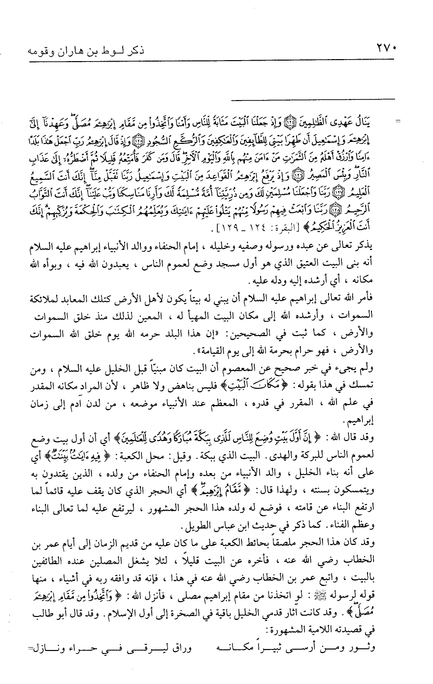 = يَنَالُ عَهْدِي الظَّالِمِينَ (١٢٤) وَإِذْ جَعَلْنَا الْبَيتَ مَثَابَةً لِلنَّاسِ وَأَمْنًا وَاتَّخِذُوا مِنْ مَقَامِ إِبْرَاهِيمَ مُصَلًّى وَعَهِدْنَا إِلَى إِبْرَاهِيمَ وَإِسْمَاعِيلَ أَنْ طَهِّرَا بَيتِيَ لِلطَّائِفِينَ وَالْعَاكِفِينَ وَالرُّكَّعِ السُّجُودِ (١٢٥) وَإِذْ قَال إِبْرَاهِيمُ رَبِّ اجْعَلْ هَذَا بَلَدًا آمِنًا وَارْزُقْ أَهْلَهُ مِنَ الثَّمَرَاتِ مَنْ آمَنَ مِنْهُمْ بِاللَّهِ وَالْيَوْمِ الْآخِرِ قَال وَمَنْ كَفَرَ فَأُمَتِّعُهُ قَلِيلًا ثُمَّ أَضْطَرُّهُ إِلَى عَذَابِ النَّارِ وَبِئْسَ الْمَصِيرُ (١٢٦) وَإِذْ يَرْفَعُ إِبْرَاهِيمُ الْقَوَاعِدَ مِنَ الْبَيتِ وَإِسْمَاعِيلُ رَبَّنَا تَقَبَّلْ مِنَّا إِنَّكَ أَنْتَ السَّمِيعُ الْعَلِيمُ (١٢٧) رَبَّنَا وَاجْعَلْنَا مُسْلِمَينِ لَكَ وَمِنْ ذُرِّيَّتِنَا أُمَّةً مُسْلِمَةً لَكَ وَأَرِنَا مَنَاسِكَنَا وَتُبْ عَلَينَا إِنَّكَ أَنْتَ التَّوَّابُ الرَّحِيمُ (١٢٨) رَبَّنَا وَابْعَثْ فِيهِمْ رَسُولًا مِنْهُمْ يَتْلُو عَلَيهِمْ آيَاتِكَ وَيُعَلِّمُهُمُ الْكِتَابَ وَالْحِكْمَةَ وَيُزَكِّيهِمْ إِنَّكَ أَنْتَ الْعَزِيزُ الْحَكِيمُ} [البقرة: ١٢٤ - ١٢٩].