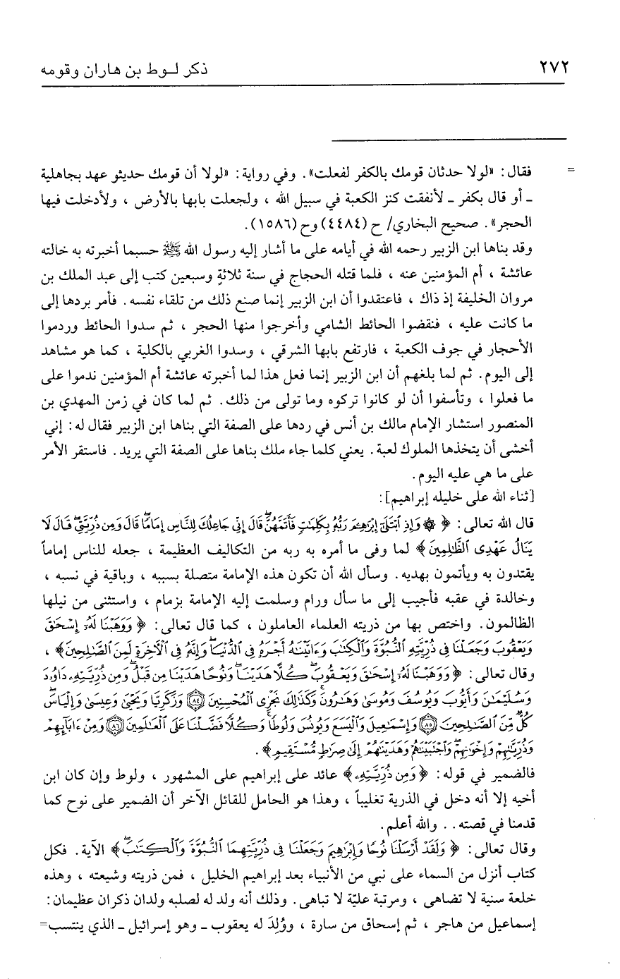 قال الله تعالى: {وَإِذِ ابْتَلَى إِبْرَاهِيمَ رَبُّهُ بِكَلِمَاتٍ فَأَتَمَّهُنَّ قَال إِنِّي جَاعِلُكَ لِلنَّاسِ إِمَامًا قَال وَمِنْ ذُرِّيَّتِي قَال لَا يَنَالُ عَهْدِي الظَّالِمِينَ} لما وفى ما أمره به ربه من التكاليف العظيمة، جعله للناس إمامًا يقتدون به ويأتمون بهديه. وسأل الله أن تكون هذه الإمامة متصلة بسببه، وباقية في نسبه، وخالدة في عقبه فأجيب إلى ما سأل ورام وسلمت إليه الإمامة بزمام، واستثنى من نيلها الظالمون. واختص بها من ذريته العلماء العاملون، كما قال تعالى: {وَوَهَبْنَا لَهُ إِسْحَاقَ وَيَعْقُوبَ وَجَعَلْنَا فِي ذُرِّيَّتِهِ النُّبُوَّةَ وَالْكِتَابَ وَآتَينَاهُ أَجْرَهُ فِي الدُّنْيَا وَإِنَّهُ فِي الْآخِرَةِ لَمِنَ الصَّالِحِينَ}، وقال تعالى: {وَوَهَبْنَا لَهُ إِسْحَاقَ وَيَعْقُوبَ كُلًّا هَدَينَا وَنُوحًا هَدَينَا مِنْ قَبْلُ وَمِنْ ذُرِّيَّتِهِ دَاوُودَ وَسُلَيمَانَ وَأَيُّوبَ وَيُوسُفَ وَمُوسَى وَهَارُونَ وَكَذَلِكَ نَجْزِي الْمُحْسِنِينَ (٨٤) وَزَكَرِيَّا وَيَحْيَى وَعِيسَى وَإِلْيَاسَ كُلٌّ مِنَ الصَّالِحِينَ (٨٥) وَإِسْمَاعِيلَ وَالْيَسَعَ وَيُونُسَ وَلُوطًا وَكُلًّا فَضَّلْنَا عَلَى الْعَالمِينَ (٨٦) وَمِنْ آبَائِهِمْ وَذُرِّيَّاتِهِمْ وَإِخْوَانِهِمْ وَاجْتَبَينَاهُمْ وَهَدَينَاهُمْ إِلَى صِرَاطٍ مُسْتَقِيمٍ}.
