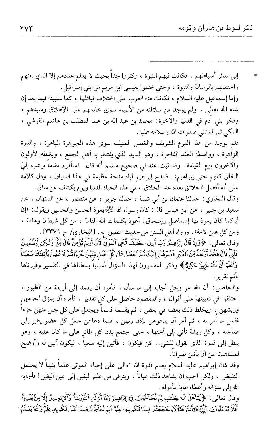وقال تعالى: {وَإِذْ قَال إِبْرَاهِيمُ رَبِّ أَرِنِي كَيفَ تُحْيِ الْمَوْتَى قَال أَوَلَمْ تُؤْمِنْ قَال بَلَى وَلَكِنْ لِيَطْمَئِنَّ قَلْبِي قَال فَخُذْ أَرْبَعَةً مِنَ الطَّيرِ فَصُرْهُنَّ إِلَيكَ ثُمَّ اجْعَلْ عَلَى كُلِّ جَبَلٍ مِنْهُنَّ جُزْءًا ثُمَّ ادْعُهُنَّ يَأْتِينَكَ سَعْيًا وَاعْلَمْ أَنَّ اللَّهَ عَزِيزٌ حَكِيمٌ} وذكر المفسرون لهذا السؤال أسبابًا بسطناها في التفسير وقررناها بأتم تقرير.