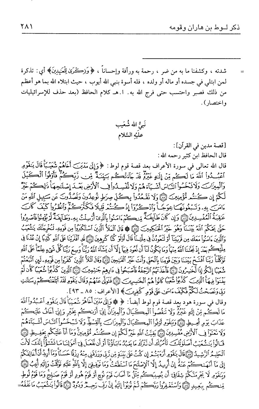 قال الله تعالى في سورة الأعراف بعد قصة قوم لوط: {وَإِلَى مَدْيَنَ أَخَاهُمْ شُعَيبًا قَال يَاقَوْمِ اعْبُدُوا اللَّهَ مَا لَكُمْ مِنْ إِلَهٍ غَيرُهُ قَدْ جَاءَتْكُمْ بَيِّنَةٌ مِنْ رَبِّكُمْ فَأَوْفُوا الْكَيلَ وَالْمِيزَانَ وَلَا تَبْخَسُوا النَّاسَ أَشْيَاءَهُمْ وَلَا تُفْسِدُوا فِي الْأَرْضِ بَعْدَ إِصْلَاحِهَا ذَلِكُمْ خَيرٌ لَكُمْ إِنْ كُنْتُمْ مُؤْمِنِينَ (٨٥) وَلَا تَقْعُدُوا بِكُلِّ صِرَاطٍ تُوعِدُونَ وَتَصُدُّونَ عَنْ سَبِيلِ اللَّهِ مَنْ آمَنَ بِهِ وَتَبْغُونَهَا عِوَجًا وَاذْكُرُوا إِذْ كُنْتُمْ قَلِيلًا فَكَثَّرَكُمْ وَانْظُرُوا كَيفَ كَانَ عَاقِبَةُ الْمُفْسِدِينَ (٨٦) وَإِنْ كَانَ طَائِفَةٌ مِنْكُمْ آمَنُوا بِالَّذِي أُرْسِلْتُ بِهِ وَطَائِفَةٌ لَمْ يُؤْمِنُوا فَاصْبِرُوا حَتَّى يَحْكُمَ اللَّهُ بَينَنَا وَهُوَ خَيرُ الْحَاكِمِينَ (٨٧) قَال الْمَلَأُ الَّذِينَ اسْتَكْبَرُوا مِنْ قَوْمِهِ لَنُخْرِجَنَّكَ يَاشُعَيبُ وَالَّذِينَ آمَنُوا مَعَكَ مِنْ قَرْيَتِنَا أَوْ لَتَعُودُنَّ فِي مِلَّتِنَا قَال أَوَلَوْ كُنَّا كَارِهِينَ (٨٨) قَدِ افْتَرَينَا عَلَى اللَّهِ كَذِبًا إِنْ عُدْنَا فِي مِلَّتِكُمْ بَعْدَ إِذْ نَجَّانَا اللَّهُ مِنْهَا وَمَا يَكُونُ لَنَا أَنْ نَعُودَ فِيهَا إلا أَنْ يَشَاءَ اللَّهُ رَبُّنَا وَسِعَ رَبُّنَا كُلَّ شَيءٍ عِلْمًا عَلَى اللَّهِ تَوَكَّلْنَا رَبَّنَا افْتَحْ بَينَنَا وَبَينَ قَوْمِنَا بِالْحَقِّ وَأَنْتَ خَيرُ الْفَاتِحِينَ (٨٩) وَقَال الْمَلَأُ الَّذِينَ كَفَرُوا مِنْ قَوْمِهِ لَئِنِ اتَّبَعْتُمْ شُعَيبًا إِنَّكُمْ إِذًا لَخَاسِرُونَ (٩٠) فَأَخَذَتْهُمُ الرَّجْفَةُ فَأَصْبَحُوا فِي دَارِهِمْ جَاثِمِينَ (٩١) الَّذِينَ كَذَّبُوا شُعَيبًا كَأَنْ لَمْ يَغْنَوْا فِيهَا الَّذِينَ كَذَّبُوا شُعَيبًا كَانُوا هُمُ الْخَاسِرِينَ (٩٢) فَتَوَلَّى عَنْهُمْ وَقَال يَاقَوْمِ لَقَدْ أَبْلَغْتُكُمْ رِسَالاتِ رَبِّي وَنَصَحْتُ لَكُمْ فَكَيفَ آسَى عَلَى قَوْمٍ كَافِرِينَ} [الأعراف: ٨٥ - ٩٣].