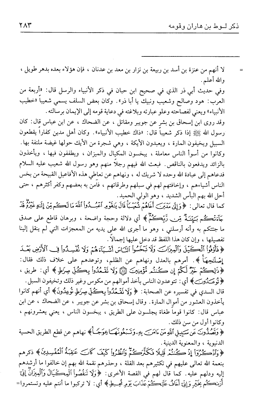 {فَأَوْفُوا الْكَيلَ وَالْمِيزَانَ وَلَا تَبْخَسُوا النَّاسَ أَشْيَاءَهُمْ وَلَا تُفْسِدُوا فِي الْأَرْضِ بَعْدَ إِصْلَاحِهَا}. أمرهم بالعدل ونهاهم عن الظلم، وتوعدهم على خلاف ذلك فقال: {ذَلِكُمْ خَيرٌ لَكُمْ إِنْ كُنْتُمْ مُؤْمِنِينَ (٨٥) وَلَا تَقْعُدُوا بِكُلِّ صِرَاطٍ} أي: طريق، {تُوعِدُونَ} أي: تتوعدون الناس بأخذ أموالهم من مكوس وغير ذلك وتخيفون السبل. قال السدي في تفسيره عن الصحابة: {وَلَا تَقْعُدُوا بِكُلِّ صِرَاطٍ تُوعِدُونَ} أي أنهم كانوا يأخذون العشور من أموال المارة. وقال إسحاق بن بشر عن جويبر، عن الضحاك، عن ابن عباس قال: كانوا قومًا طغاة يجلسون على الطريق، يبخسون الناس، يعني يعشرونهم، وكانوا أول من سن ذلك.