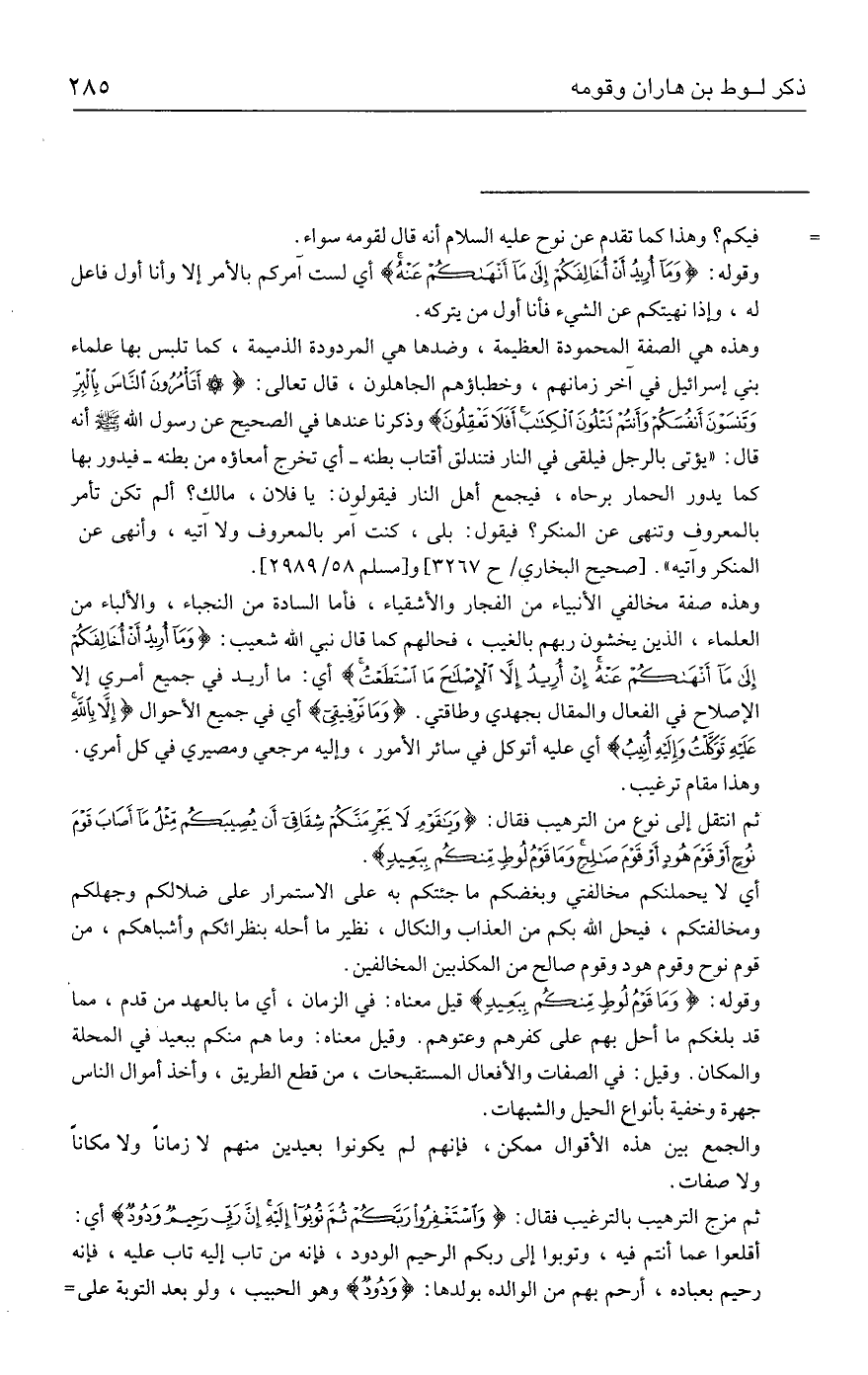 وهذه صفة مخالفي الأنبياء من الفجار والأشقياء، فأما السادة من النجباء، والألباء من العلماء، الذين يخشون ربهم بالغيب، فحالهم كما قال نبي الله شعيب: {وَمَا أُرِيدُ أَنْ أُخَالِفَكُمْ إِلَى مَا أَنْهَاكُمْ عَنْهُ إِنْ أُرِيدُ إلا الْإِصْلَاحَ مَا اسْتَطَعْتُ} أي؟ ما أريد في جميع أمري إلا الإصلاح في الفعال والمقال بجهدي وطاقتي. {وَمَا تَوْفِيقِي} أي في جميع الأحوال {إلا بِاللَّهِ عَلَيهِ تَوَكَّلْتُ وَإِلَيهِ أُنِيبُ} أي عليه أتوكل في سائر الأمور، وإليه مرجعي ومصيري في كل أمري. وهذا مقام ترغيب.
