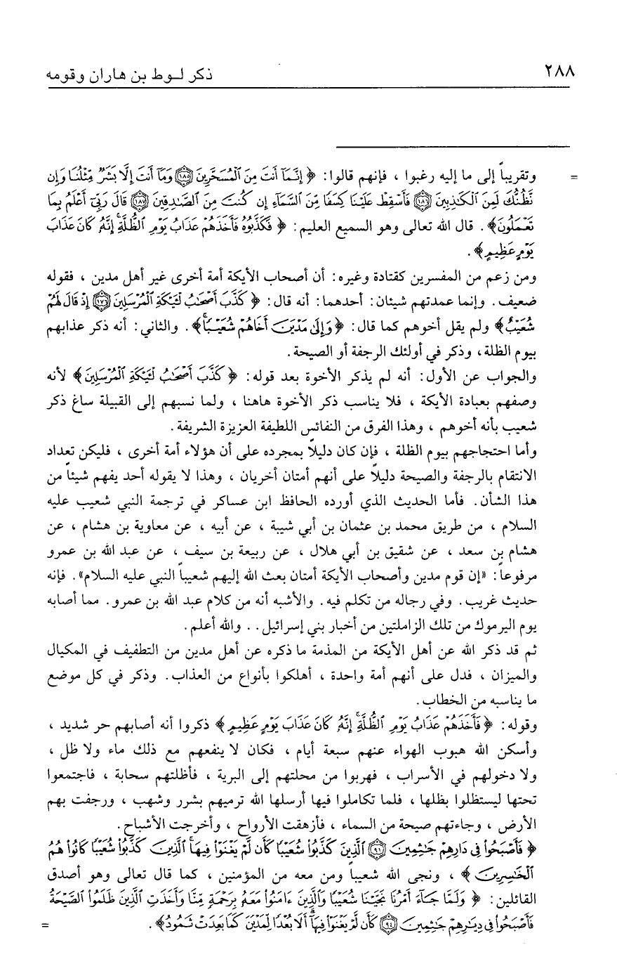 وأما احتجاجهم بيوم الظلة، فإن كان دليلًا بمجرده على أن هؤلاء أمة أخرى، فليكن تعداد الانتقام بالرجفة والصيحة دليلًا على أنهم أمتان أخريان، وهذا لا يقوله أحد يفهم شيئًا من هذا الشأن. فأما الحديث الذي أورده الحافظ ابن عساكر في ترجمة النبي شعيب عليه السلام، من طريق محمد بن عثمان بن أبي شيبة، عن أبيه، عن معاوية بن هشام، عن هشام بن سعد، عن شقيق بن أبي هلال، عن ربيعة بن سيف، عن عبد الله بن عمرو مرفوعًا "إن قوم مدين وأصحاب الأيكة أمتان بعث الله إليهم شعيبًا النبي - عليه السلام -". فإنه حديث غريب. وفي رجاله من تكلم فيه. والأشبه أنه من كلام عبد الله بن عمرو. مما أصابه يوم اليرموك من تلك الزاملتين من أخبار بني إسرائيل .. والله أعلم.