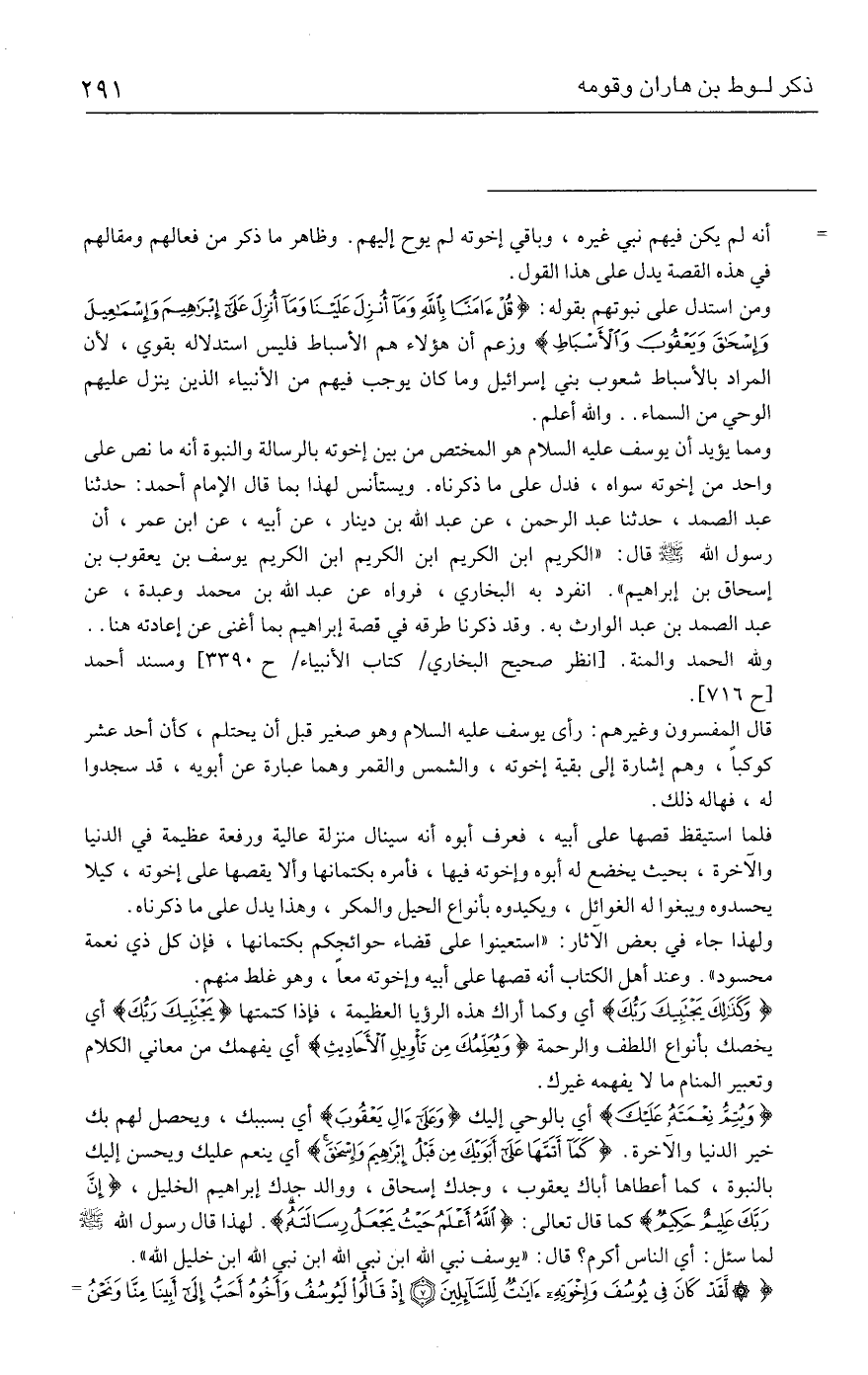 ومما يؤيد أن يوسف - عليه السلام - هو المختص من بين إخوته بالرسالة والنبوة أنه ما نص على واحد من إخوته سواه، فدل على ما ذكرناه. ويستأنس لهذا بما قال الإمام أحمد: حدثنا عبد الصمد، حدثنا عبد الرحمن، عن عبد الله بن دينار، عن أبيه، عن ابن عمر، أن رسول الله - صلى الله عليه وسلم - قال: "الكريم ابن الكريم ابن الكريم ابن الكريم يوسف بن يعقوب بن إسحاق بن إبراهيم". انفرد به البخاري، فرواه عن عبد الله بن محمد وعبدة، عن عبد الصمد بن عبد الوارث به. وقد ذكرنا طرقه في قصة إبراهيم بما أغنى عن إعادته هنا .. ولله الحمد والمنة. [انظر صحيح البخاري / كتاب الأنبياء / ح ٣٣٩٠] ومسند أحمد [ح ٧١٦].