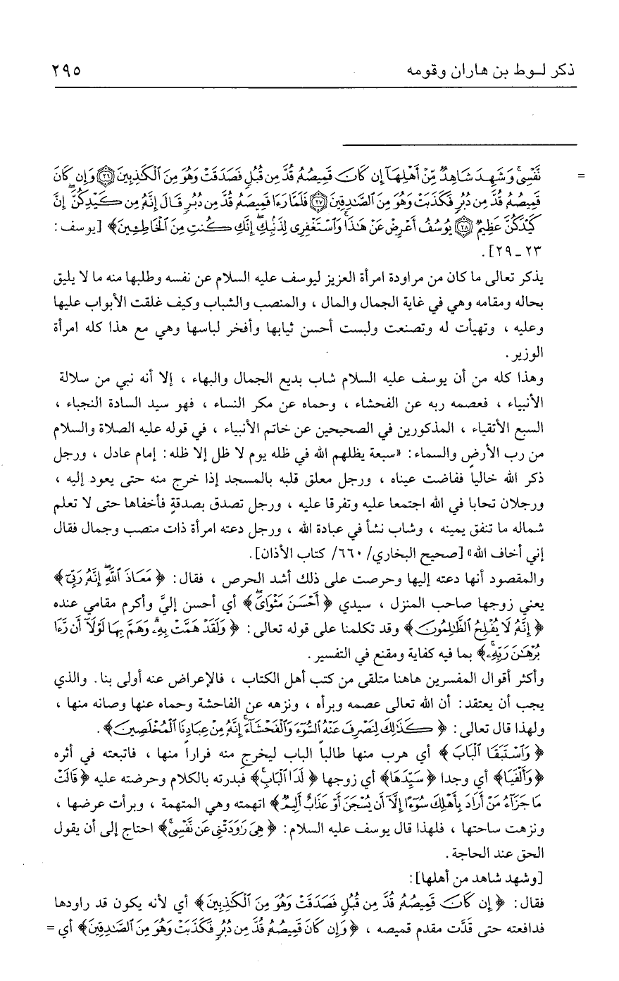 = نَفْسِي وَشَهِدَ شَاهِدٌ مِنْ أَهْلِهَا إِنْ كَانَ قَمِيصُهُ قُدَّ مِنْ قُبُلٍ فَصَدَقَتْ وَهُوَ مِنَ الْكَاذِبِينَ (٢٦) وَإِنْ كَانَ قَمِيصُهُ قُدَّ مِنْ دُبُرٍ فَكَذَبَتْ وَهُوَ مِنَ الصَّادِقِينَ (٢٧) فَلَمَّا رَأَى قَمِيصَهُ قُدَّ مِنْ دُبُرٍ قَال إِنَّهُ مِنْ كَيدِكُنَّ إِنَّ كَيدَكُنَّ عَظِيمٌ (٢٨) يُوسُفُ أَعْرِضْ عَنْ هَذَا وَاسْتَغْفِرِي لِذَنْبِكِ إِنَّكِ كُنْتِ مِنَ الْخَاطِئِينَ} [يوسف: ٢٣ - ٢٩].