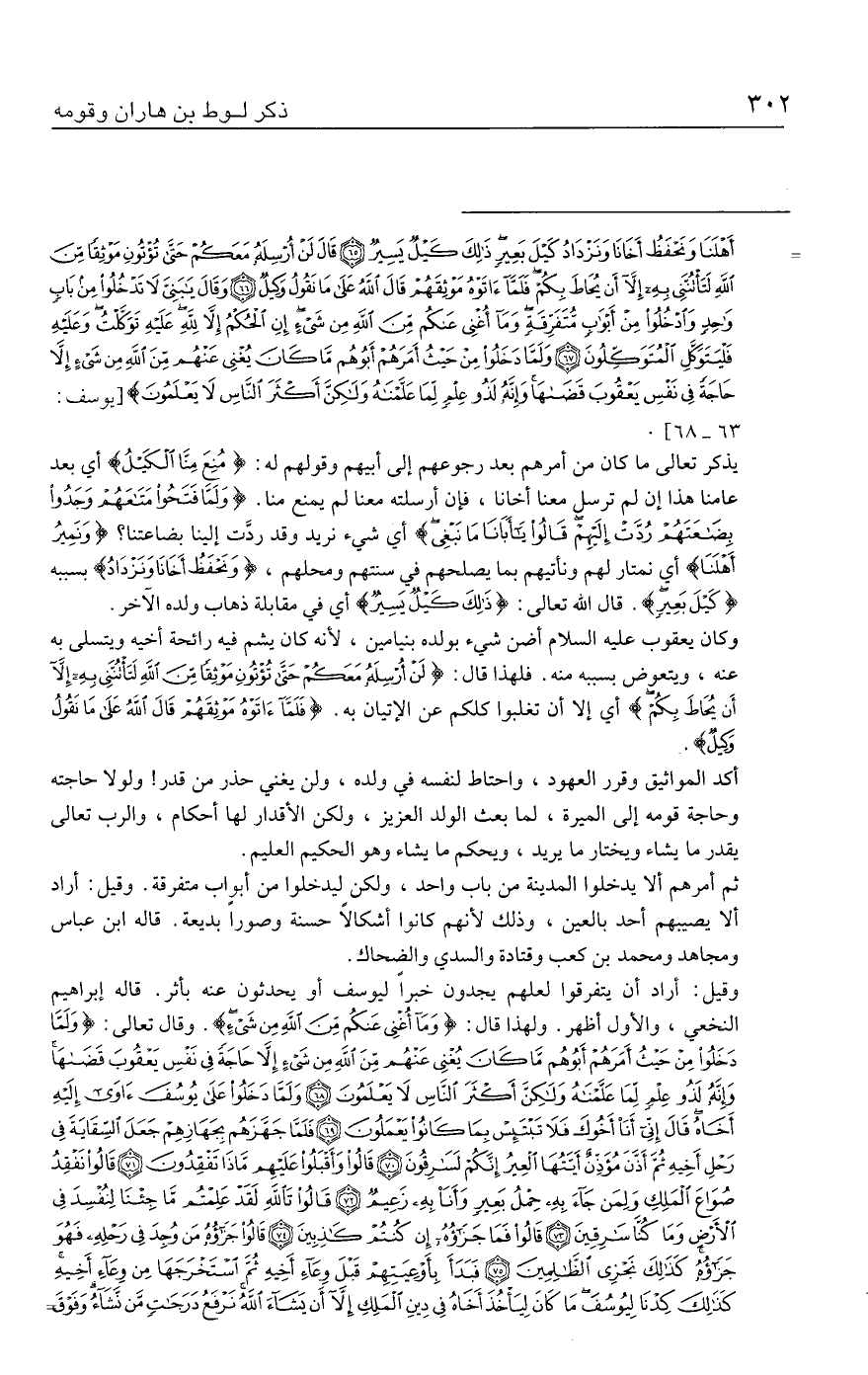 = أَهْلَنَا وَنَحْفَظُ أَخَانَا وَنَزْدَادُ كَيلَ بَعِيرٍ ذَلِكَ كَيلٌ يَسِيرٌ (٦٥) قَال لَنْ أُرْسِلَهُ مَعَكُمْ حَتَّى تُؤْتُونِ مَوْثِقًا مِنَ اللَّهِ لَتَأْتُنَّنِي بِهِ إلا أَنْ يُحَاطَ بِكُمْ فَلَمَّا آتَوْهُ مَوْثِقَهُمْ قَال اللَّهُ عَلَى مَا نَقُولُ وَكِيلٌ (٦٦) وَقَال يَابَنِيَّ لَا تَدْخُلُوا مِنْ بَابٍ وَاحِدٍ وَادْخُلُوا مِنْ أَبْوَابٍ مُتَفَرِّقَةٍ وَمَا أُغْنِي عَنْكُمْ مِنَ اللَّهِ مِنْ شَيءٍ إِنِ الْحُكْمُ إلا لِلَّهِ عَلَيهِ تَوَكَّلْتُ وَعَلَيهِ فَلْيَتَوَكَّلِ الْمُتَوَكِّلُونَ (٦٧) وَلَمَّا دَخَلُوا مِنْ حَيثُ أَمَرَهُمْ أَبُوهُمْ مَا كَانَ يُغْنِي عَنْهُمْ مِنَ اللَّهِ مِنْ شَيءٍ إلا حَاجَةً فِي نَفْسِ يَعْقُوبَ قَضَاهَا وَإِنَّهُ لَذُو عِلْمٍ لِمَا عَلَّمْنَاهُ وَلَكِنَّ أَكْثَرَ النَّاسِ لَا يَعْلَمُونَ} [يوسف: ٦٣ - ٦٨].