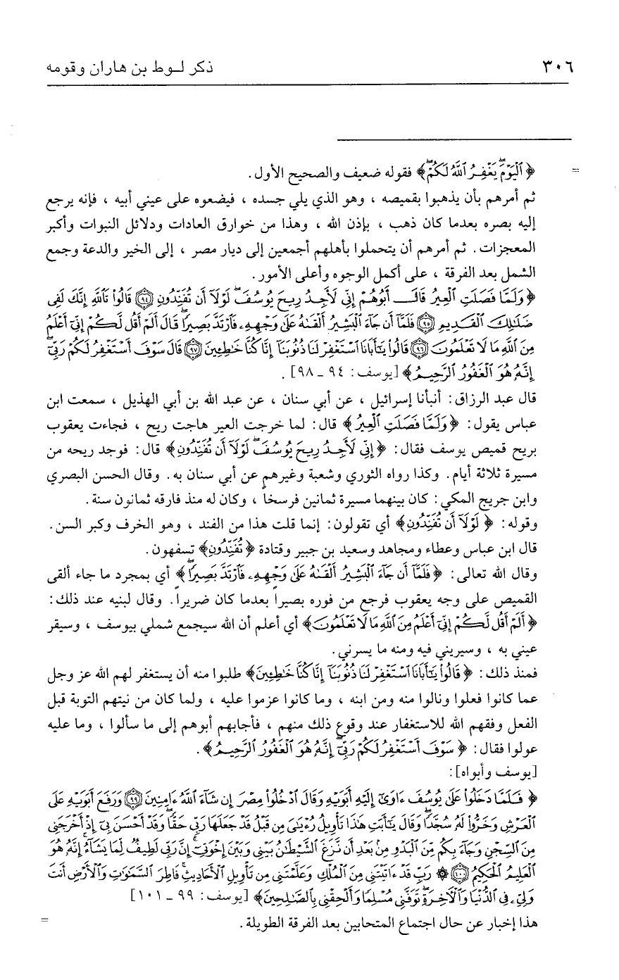 {وَلَمَّا فَصَلَتِ الْعِيرُ قَال أَبُوهُمْ إِنِّي لَأَجِدُ رِيحَ يُوسُفَ لَوْلَا أَنْ تُفَنِّدُونِ (٩٤) قَالُوا تَاللَّهِ إِنَّكَ لَفِي ضَلَالِكَ الْقَدِيمِ (٩٥) فَلَمَّا أَنْ جَاءَ الْبَشِيرُ أَلْقَاهُ عَلَى وَجْهِهِ فَارْتَدَّ بَصِيرًا قَال أَلَمْ أَقُلْ لَكُمْ إِنِّي أَعْلَمُ مِنَ اللَّهِ مَا لَا تَعْلَمُونَ (٩٦) قَالُوا يَاأَبَانَا اسْتَغْفِرْ لَنَا ذُنُوبَنَا إِنَّا كُنَّا خَاطِئِينَ (٩٧) قَال سَوْفَ أَسْتَغْفِرُ لَكُمْ رَبِّي إِنَّهُ هُوَ الْغَفُورُ الرَّحِيمُ} [يوسف ٩٤: ٩٨].