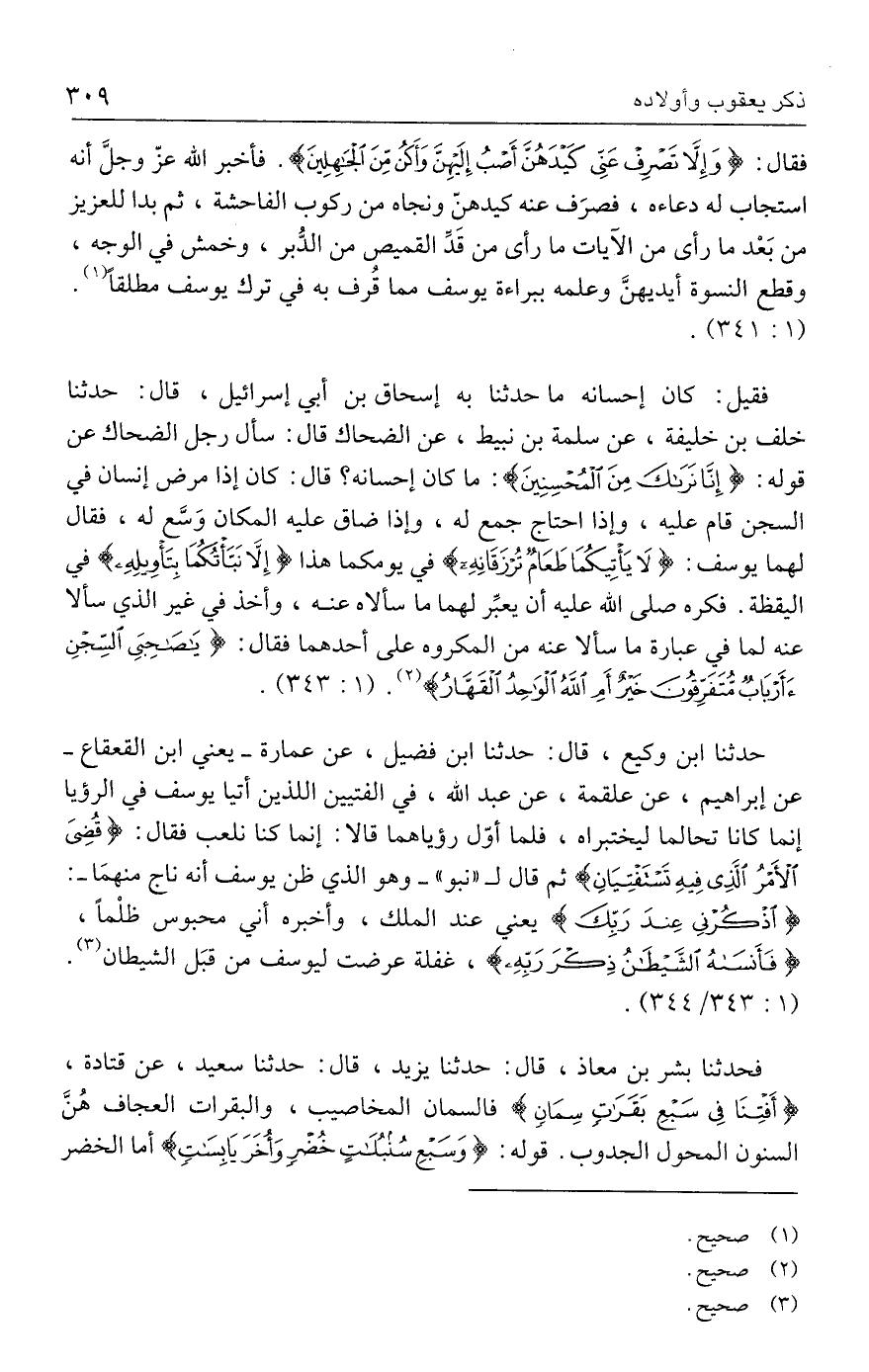 حدثنا ابن وكيع، قال: حدثنا ابن فضيل، عن عمارة -يعني ابن القعقاع- عن إبراهيم، عن علقمة، عن عبد الله، في الفتيين اللذين أتيا يوسف في الرؤيا إنما كانا تحالما ليختبراه، فلما أوّلى رؤياهما قالا: إنما كنا نلعب فقال: {قُضِيَ الْأَمْرُ الَّذِي فِيهِ تَسْتَفْتِيَانِ} ثم قال لـ "نبو" -وهو الذي ظن يوسف أنه ناج منهما-: {اذْكُرْنِي عِنْدَ رَبِّكَ} يعني عند الملك، وأخبره أني محبوس ظلْمًا، {فَأَنْسَاهُ الشَّيطَانُ ذِكْرَ رَبِّهِ}، غفلة عرضت ليوسف من قبَل الشيطان (٣). (١: ٣٤٣/ ٣٤٤).
