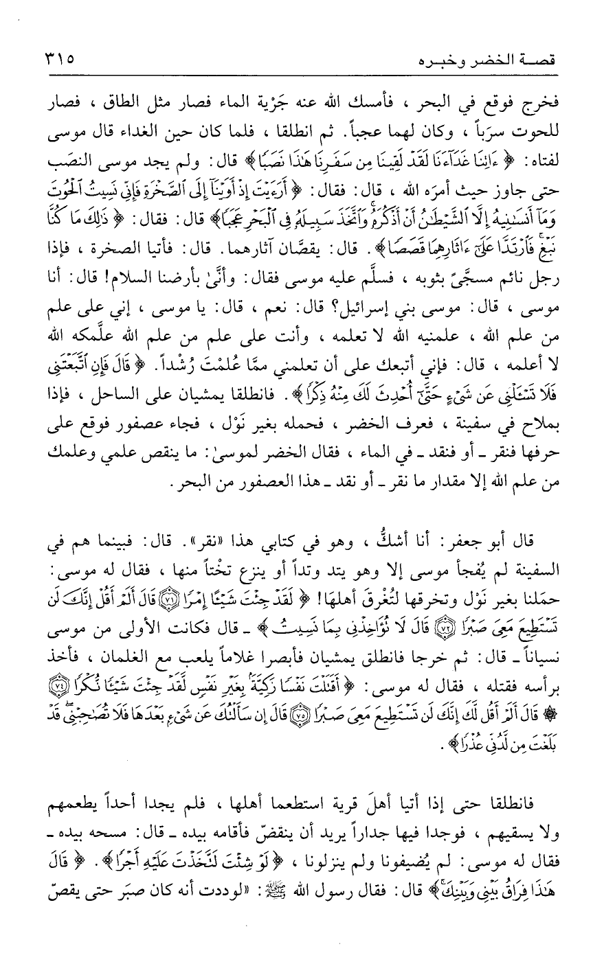 فخرج فوقع في البحر، فأمسك الله عنه جَرْية الماء فصار مثل الطاق، فصار للحوت سرَبًا، وكان لهما عجبًا. ثم انطلقا، فلما كان حين الغداء قال موسى لفتاه: {آتِنَا غَدَاءَنَا لَقَدْ لَقِينَا مِنْ سَفَرِنَا هَذَا نَصَبًا} قال: ولم يجد موسى النصَب حتى جاوز حيث أمرَه الله، قال: فقال: {أَرَأَيتَ إِذْ أَوَينَا إِلَى الصَّخْرَةِ فَإِنِّي نَسِيتُ الْحُوتَ وَمَا أَنْسَانِيهُ إلا الشَّيطَانُ أَنْ أَذْكُرَهُ وَاتَّخَذَ سَبِيلَهُ فِي الْبَحْرِ عَجَبًا} قال: فقال: {ذَلِكَ مَا كُنَّا نَبْغِ فَارْتَدَّا عَلَى آثَارِهِمَا قَصَصًا}. قال: يقصَّان آثارهما. قال: فأتيا الصخرة، فإذا رجل نائم مسجّى بثوبه، فسلَّم عليه موسى فقال: وأنَّى بأرضنا السلام! قال: أنا موسى، قال: موسى بني إسرائيل؟ قال: نعم، قال: يا موسى، إني على علم من علم الله، علمنيه الله لا تعلمه، وأنت على علم من علم الله علَّمكه الله لا أعلمه، قال: فإني أتبعك على أن تعلمني ممَّا عُلمْتَ رُشْدًا. {قَال فَإِنِ اتَّبَعْتَنِي فَلَا تَسْأَلْنِي عَنْ شَيءٍ حَتَّى أُحْدِثَ لَكَ مِنْهُ ذِكْرًا}. فانطلقا يمشيان على الساحل، فإذا بملاح في سفينة، فعرف الخضر، فحمله بغير نَوْل، فجاء عصفور فوقع على حرفها فنقر -أو فنقد- في الماء، فقال الخضر لموسى: ما ينقص علمي وعلمك من علم الله إلَّا مقدار ما نقر -أو نقد- هذا العصفور من البحر.