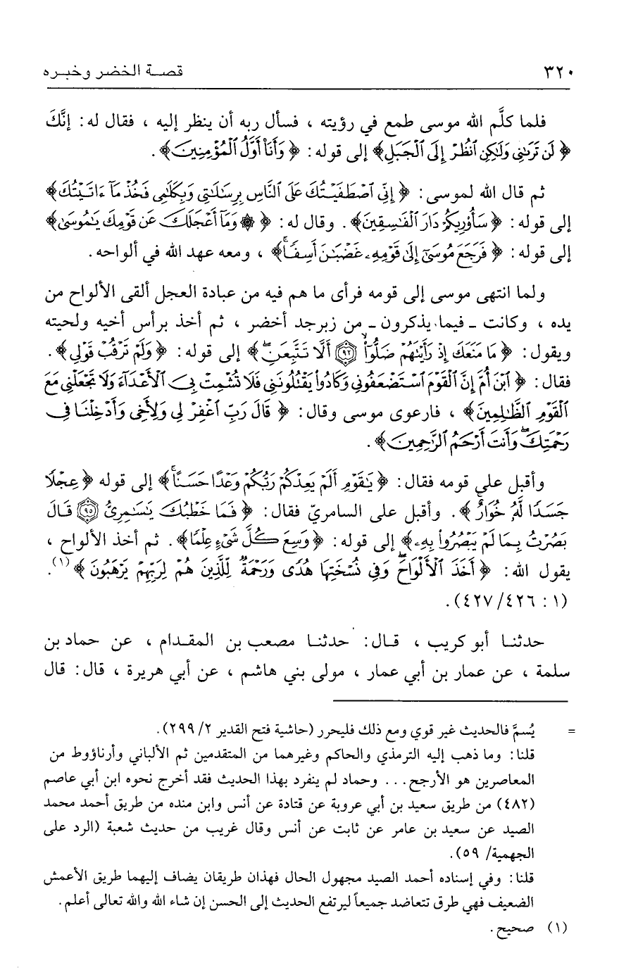 وأقبل على قومه فقال: {يَاقَوْمِ أَلَمْ يَعِدْكُمْ رَبُّكُمْ وَعْدًا حَسَنًا} إلى قوله {عِجْلًا جَسَدًا لَهُ خُوَارٌ}. وأقبل على السامريّ فقال: {قَال فَمَا خَطْبُكَ يَاسَامِرِيُّ (٩٥) قَال بَصُرْتُ بِمَا لَمْ يَبْصُرُوا بِهِ} إلى قوله: {وَسِعَ كُلَّ شَيءٍ عِلْمًا}. ثم أخذ الألواح، يقول الله: {أَخَذَ الْأَلْوَاحَ وَفِي نُسْخَتِهَا هُدًى وَرَحْمَةٌ لِلَّذِينَ هُمْ لِرَبِّهِمْ يَرْهَبُونَ} (١). (١: ٤٢٦/ ٤٢٧).