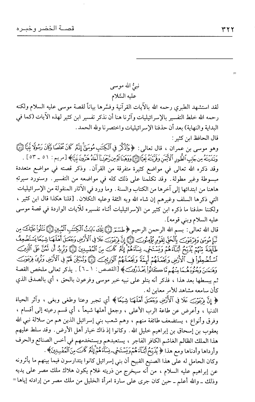 وقد ذكره الله تعالى في مواضع كثيرة متفرقة من القرآن. وذكر قصته في مواضع متعددة مبسوطة وغير مطولة. وقد تكلمنا على ذلك كله في مواضعه من التفسير. وسنورد سيرته هاهنا من ابتدائها إلى آخرها من الكتاب والسنة. وما ورد في الآثار المنقولة من الإسرائيليات التي ذكرها السلف وغيرهم إن شاء الله وبه الثقة وعليه التكلان. [قلنا هكذا قال ابن كثير، ولكننا حذفنا ما ذكره ابن كثير من الإسرائيليات أثناء تفسيره للآيات الواردة في قصة موسى - عليه السلام - وبني قومه].