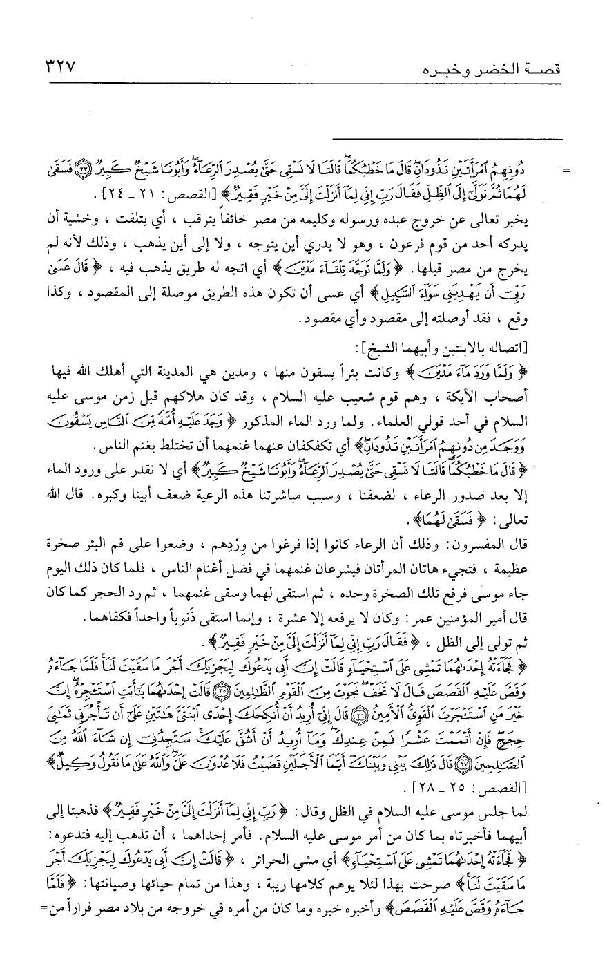 = مِنْ دُونِهِمُ امْرَأَتَينِ تَذُودَانِ قَال مَا خَطْبُكُمَا قَالتَا لَا نَسْقِي حَتَّى يُصْدِرَ الرِّعَاءُ وَأَبُونَا شَيخٌ كَبِيرٌ (٢٣) فَسَقَى لَهُمَا ثُمَّ تَوَلَّى إِلَى الظِّلِّ فَقَال رَبِّ إِنِّي لِمَا أَنْزَلْتَ إِلَيَّ مِنْ خَيرٍ فَقِيرٌ} [القصص: ٢١ - ٢٤].