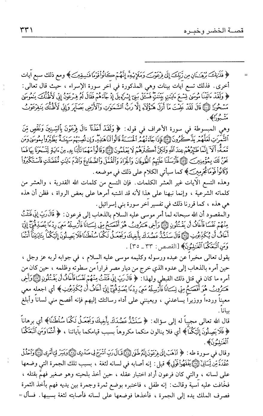 = {فَذَانِكَ بُرْهَانَانِ مِنْ رَبِّكَ إِلَى فِرْعَوْنَ وَمَلَئِهِ إِنَّهُمْ كَانُوا قَوْمًا فَاسِقِينَ} ومع ذلك سبع آيات أخرى. فذلك تسع آيات بينات وهي المذكورة في آخر سورة الإسراء، حيث قال تعالى: {وَلَقَدْ آتَينَا مُوسَى تِسْعَ آيَاتٍ بَيِّنَاتٍ فَاسْأَلْ بَنِي إِسْرَائِيلَ إِذْ جَاءَهُمْ فَقَال لَهُ فِرْعَوْنُ إِنِّي لَأَظُنُّكَ يَامُوسَى مَسْحُورًا (١٠١) قَال لَقَدْ عَلِمْتَ مَا أَنْزَلَ هَؤُلَاءِ إلا رَبُّ السَّمَاوَاتِ وَالْأَرْضِ بَصَائِرَ وَإِنِّي لَأَظُنُّكَ يَافِرْعَوْنُ مَثْبُورًا}.