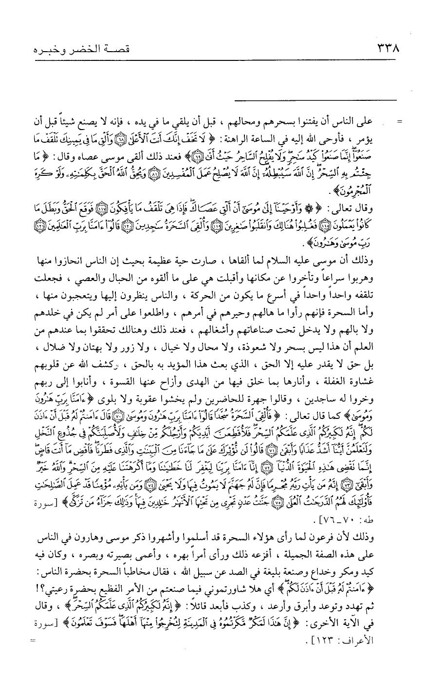 وقال تعالى: {وَأَوْحَينَا إِلَى مُوسَى أَنْ أَلْقِ عَصَاكَ فَإِذَا هِيَ تَلْقَفُ مَا يَأْفِكُونَ (١١٧) فَوَقَعَ الْحَقُّ وَبَطَلَ مَا كَانُوا يَعْمَلُونَ (١١٨) فَغُلِبُوا هُنَالِكَ وَانْقَلَبُوا صَاغِرِينَ (١١٩) وَأُلْقِيَ السَّحَرَةُ سَاجِدِينَ (١٢٠) قَالُوا آمَنَّا بِرَبِّ الْعَالمِينَ (١٢١) رَبِّ مُوسَى وَهَارُونَ}.
