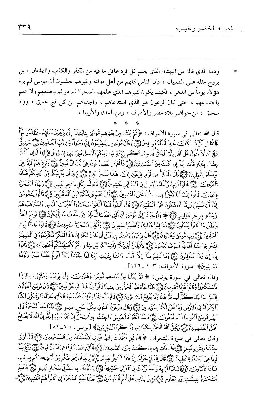 قال الله تعالى في سورة الأعراف: {ثُمَّ بَعَثْنَا مِنْ بَعْدِهِمْ مُوسَى بِآيَاتِنَا إِلَى فِرْعَوْنَ وَمَلَئِهِ فَظَلَمُوا بِهَا فَانْظُرْ كَيفَ كَانَ عَاقِبَةُ الْمُفْسِدِينَ (١٠٣) وَقَال مُوسَى يَافِرْعَوْنُ إِنِّي رَسُولٌ مِنْ رَبِّ الْعَالمِينَ (١٠٤) حَقِيقٌ عَلَى أَنْ لَا أَقُولَ عَلَى اللَّهِ إلا الْحَقَّ قَدْ جِئْتُكُمْ بِبَيِّنَةٍ مِنْ رَبِّكُمْ فَأَرْسِلْ مَعِيَ بَنِي إِسْرَائِيلَ (١٠٥) قَال إِنْ كُنْتَ جِئْتَ بِآيَةٍ فَأْتِ بِهَا إِنْ كُنْتَ مِنَ الصَّادِقِينَ (١٠٦) فَأَلْقَى عَصَاهُ فَإِذَا هِيَ ثُعْبَانٌ مُبِينٌ (١٠٧) وَنَزَعَ يَدَهُ فَإِذَا هِيَ بَيضَاءُ لِلنَّاظِرِينَ (١٠٨) قَال الْمَلَأُ مِنْ قَوْمِ فِرْعَوْنَ إِنَّ هَذَا لَسَاحِرٌ عَلِيمٌ (١٠٩) يُرِيدُ أَنْ يُخْرِجَكُمْ مِنْ أَرْضِكُمْ فَمَاذَا تَأْمُرُونَ (١١٠) قَالُوا أَرْجِهْ وَأَخَاهُ وَأَرْسِلْ فِي الْمَدَائِنِ حَاشِرِينَ (١١١) يَأْتُوكَ بِكُلِّ سَاحِرٍ عَلِيمٍ (١١٢) وَجَاءَ السَّحَرَةُ فِرْعَوْنَ قَالُوا إِنَّ لَنَا لَأَجْرًا إِنْ كُنَّا نَحْنُ الْغَالِبِينَ (١١٣) قَال نَعَمْ وَإِنَّكُمْ لَمِنَ الْمُقَرَّبِينَ (١١٤) قَالُوا يَامُوسَى إِمَّا أَنْ تُلْقِيَ وَإِمَّا أَنْ نَكُونَ نَحْنُ الْمُلْقِينَ (١١٥) قَال أَلْقُوا فَلَمَّا أَلْقَوْا سَحَرُوا أَعْيُنَ النَّاسِ وَاسْتَرْهَبُوهُمْ وَجَاءُوا بِسِحْرٍ عَظِيمٍ (١١٦) وَأَوْحَينَا إِلَى مُوسَى أَنْ أَلْقِ عَصَاكَ فَإِذَا هِيَ تَلْقَفُ مَا يَأْفِكُونَ (١١٧) فَوَقَعَ الْحَقُّ وَبَطَلَ مَا كَانُوا يَعْمَلُونَ (١١٨) فَغُلِبُوا هُنَالِكَ وَانْقَلَبُوا صَاغِرِينَ (١١٩) وَأُلْقِيَ السَّحَرَةُ سَاجِدِينَ (١٢٠) قَالُوا آمَنَّا بِرَبِّ الْعَالمِينَ (١٢١) رَبِّ مُوسَى وَهَارُونَ (١٢٢) قَال فِرْعَوْنُ آمَنْتُمْ بِهِ قَبْلَ أَنْ آذَنَ لَكُمْ إِنَّ هَذَا لَمَكْرٌ مَكَرْتُمُوهُ فِي الْمَدِينَةِ لِتُخْرِجُوا مِنْهَا أَهْلَهَا فَسَوْفَ تَعْلَمُونَ (١٢٣) لَأُقَطِّعَنَّ أَيدِيَكُمْ وَأَرْجُلَكُمْ مِنْ خِلَافٍ ثُمَّ لَأُصَلِّبَنَّكُمْ أَجْمَعِينَ (١٢٤) قَالُوا إِنَّا إِلَى رَبِّنَا مُنْقَلِبُونَ (١٢٥) وَمَا تَنْقِمُ مِنَّا إلا أَنْ آمَنَّا بِآيَاتِ رَبِّنَا لَمَّا جَاءَتْنَا رَبَّنَا أَفْرِغْ عَلَينَا صَبْرًا وَتَوَفَّنَا مُسْلِمِينَ} [سورة الأعراف: ١٠٣ - ١٢٦].