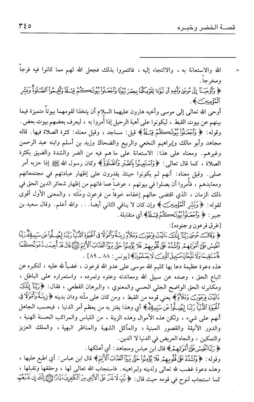 أوحى الله تعالى إلى موسى وأخيه هارون عليهما السلام أن يتخذا لقومهما بيوتًا متميزة فيما بينهم عن بيوت القبط، ليكونوا على أهبة الرحيل إذا أُمروا به، ليعرف بعضهم بيوت بعض. وقوله: {وَاجْعَلُوا بُيُوتَكُمْ قِبْلَةً} قيل: مساجد، وقيل معناه: كثرة الصلاة فيها. قاله مجاهد وأبو مالك وإبراهيم النخعي والربيع والضحاك وزيد بن أسلم وابنه عبد الرحمن وغيرهم. ومعناه على هذا: الاستعانة على ما هم فيه من الضر والشدة والضيق بكثرة الصلاة، كما قال تعالى: {وَاسْتَعِينُوا بِالصَّبْرِ وَالصَّلَاةِ} وكان رسول الله - صلى الله عليه وسلم - إذا حزبه أمر صلى. وقيل معناه: أنهم لم يكونوا حينئذ يقدرون على إظهار عبادتهم في مجتمعاتهم ومعابدهم، فأُمروا أن يصلوا في بيوتهم، عوضًا عما فاتهم من إظهار شعائر الدين الحق في ذلك الزمان، الذي اقتضى حالهم إخفاءه خوفًا من فرعون ومَلَئه، والمعنى الأول أقوى لقوله: {وَبَشِّرِ الْمُؤْمِنِينَ} وإن كان لا ينافي الثاني أيضًا ... والله أعلم. وقال سعيد بن جبير: {وَاجْعَلُوا بُيُوتَكُمْ قِبْلَةً} أي متقابلة.