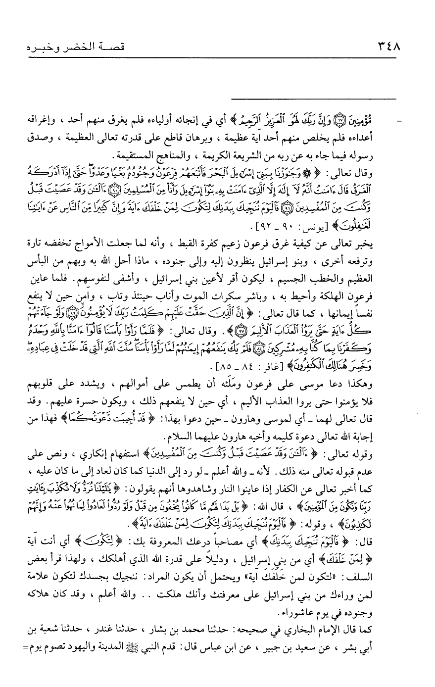 وقال تعالى: {وَجَاوَزْنَا بِبَنِي إِسْرَائِيلَ الْبَحْرَ فَأَتْبَعَهُمْ فِرْعَوْنُ وَجُنُودُهُ بَغْيًا وَعَدْوًا حَتَّى إِذَا أَدْرَكَهُ الْغَرَقُ قَال آمَنْتُ أَنَّهُ لَا إِلَهَ إلا الَّذِي آمَنَتْ بِهِ بَنُو إِسْرَائِيلَ وَأَنَا مِنَ الْمُسْلِمِينَ (٩٠) آلْآنَ وَقَدْ عَصَيتَ قَبْلُ وَكُنْتَ مِنَ الْمُفْسِدِينَ (٩١) فَالْيَوْمَ نُنَجِّيكَ بِبَدَنِكَ لِتَكُونَ لِمَنْ خَلْفَكَ آيَةً وَإِنَّ كَثِيرًا مِنَ النَّاسِ عَنْ آيَاتِنَا لَغَافِلُونَ} [يونس: ٩٠ - ٩٢].
