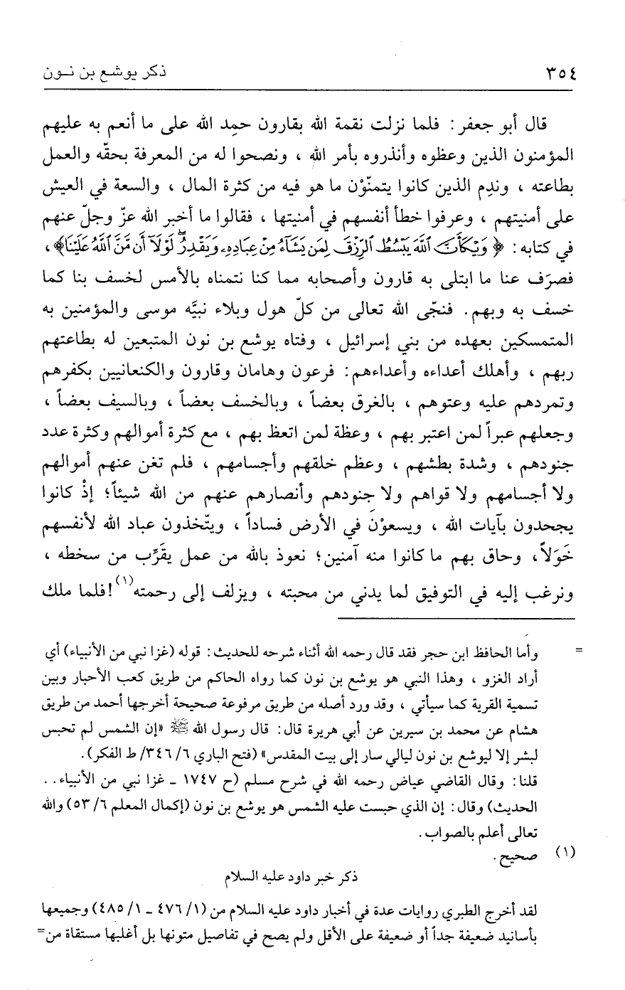 قال أبو جعفر: فلما نزلت نقمة الله بقارون حمِد الله على ما أنعم به عليهم المؤمنون الذين وعظوه وأنذروه بأمر الله، ونصحوا له من المعرفة بحقّه والعمل بطاعته، وندِم الذين كانوا يتمنّوْن ما هو فيه من كثرة المال، والسعة في العيش على أمنيتهم، وعرفوا خطأ أنفسهم في أمنيتها، فقالوا ما أخبر الله عزّ وجلّ عنهم في كتابه: {وَيكَأَنَّ اللَّهَ يَبْسُطُ الرِّزْقَ لِمَنْ يَشَاءُ مِنْ عِبَادِهِ وَيَقْدِرُ لَوْلَا أَنْ مَنَّ اللَّهُ عَلَينَا}، فصرَف عنا ما ابتلى به قارون وأصحابه مما كنا نتمناه بالأمس لخسف بنا كما خسف به وبهم. فنجّى الله تعالى من كلّ هول وبلاء نبيَّه موسى والمؤمنين به المتمسكين بعهده من بني إسرائيل، وفتاه يوشع بن نون المتبعين له بطاعتهم ربهم، وأهلك أعداءه وأعداءهم: فرعون وهامان وقارون والكنعانيين بكفرهم وتمردهم عليه وعتوهم، بالغرق بعضًا، وبالخسف بعضًا، وبالسيف بعضًا، وجعلهم عبرًا لمن اعتبر بهم، وعظة لمن اتعظ بهم، مع كثرة أموالهم وكثرة عدد جنودهم، وشدة بطشهم، وعظم خلقهم وأجسامهم، فلم تغن عنهم أموالهم ولا أجسامهم ولا قواهم ولا جنودهم وأنصارهم عنهم من الله شيئًا؛ إذْ كانوا يجحدون بآيات الله، ويسعوْنَ في الأرض فسادًا، ويتّخذون عباد الله لأنفسهم خَوَلًا، وحاق بهم ما كانوا منه آمنين؛ نعوذ بالله من عمل يقَرِّب من سخطه، ونرغب إليه في التوفيق لما يدني من محبته، ويزلف إلى رحمته (١)! فلما ملك