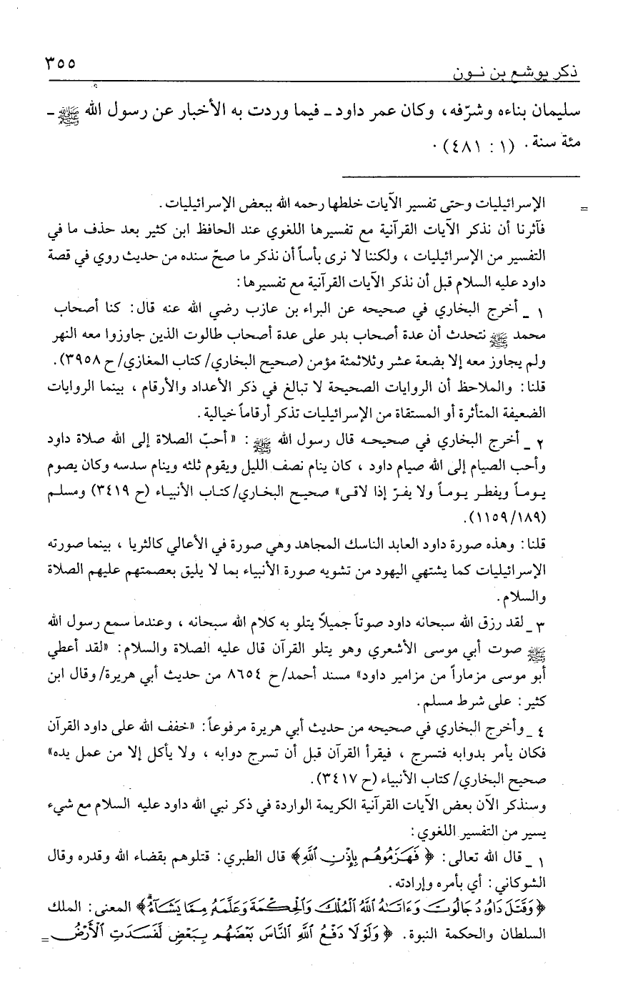 فآثرنا أن نذكر الآيات القرآنية مع تفسيرها اللغوي عند الحافظ ابن كثير بعد حذف ما في التفسير من الإسرائيليات، ولكننا لا نرى بأسًا أن نذكر ما صحّ سنده من حديث روي في قصة داود - عليه السلام - قبل أن نذكر الآيات القرآنية مع تفسيرها: