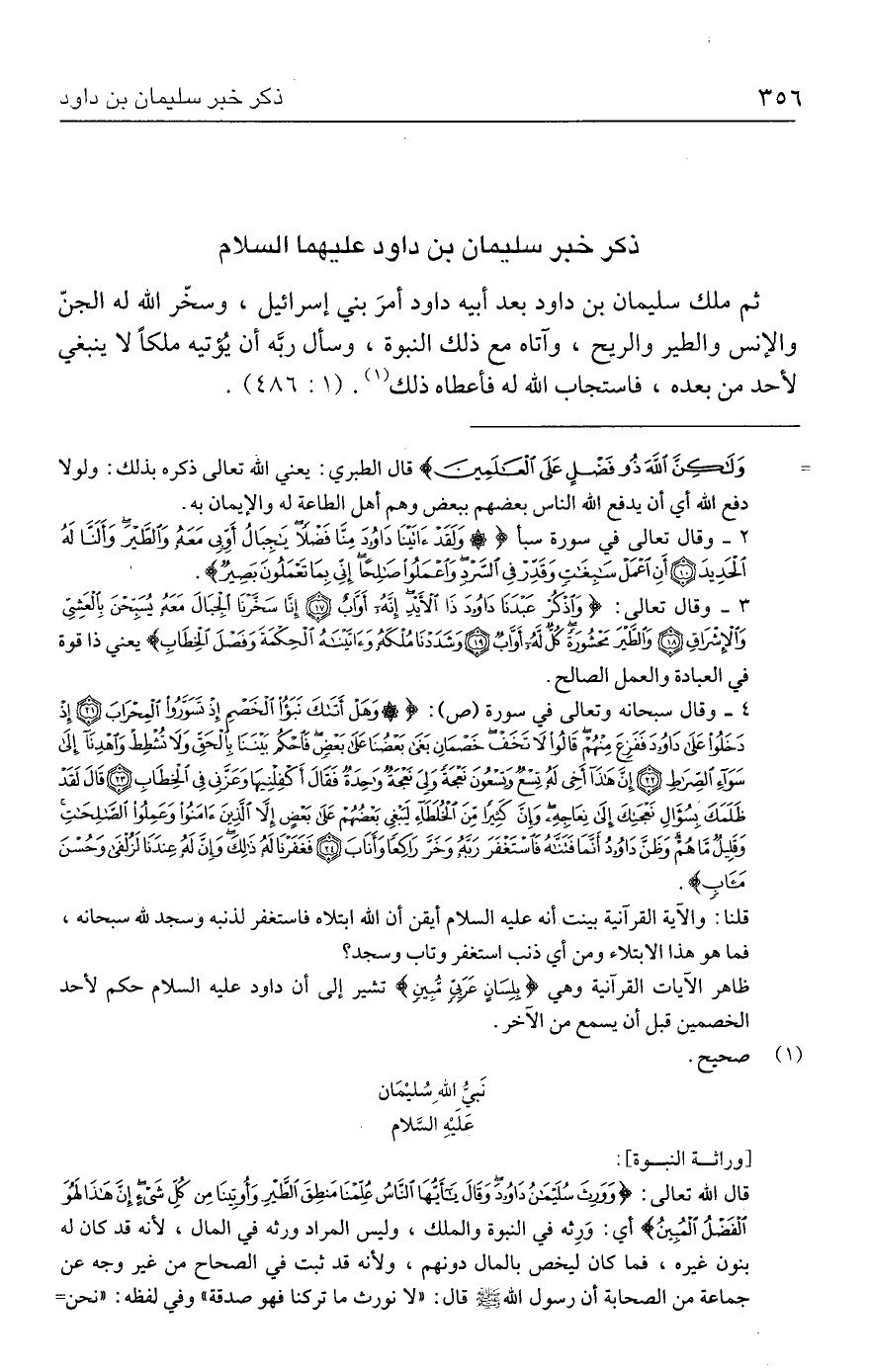 قال الله تعالى: {وَوَرِثَ سُلَيمَانُ دَاوُودَ وَقَال يَا أَيُّهَا النَّاسُ عُلِّمْنَا مَنْطِقَ الطَّيرِ وَأُوتِينَا مِنْ كُلِّ شَيءٍ إِنَّ هَذَا لَهُوَ الْفَضْلُ الْمُبِينُ} أي: وَرِثه في النبوة والملك، وليس المراد ورثه في المال, لأنه قد كان له بنون غيره، فما كان ليخص بالمال دونهم، ولأنه قد ثبت في الصحاح من غير وجه عن جماعة من الصحابة أن رسول الله - صلى الله عليه وسلم - قال: "لا نورث ما تركنا فهو صدقة" وفي لفظه: "نحن =