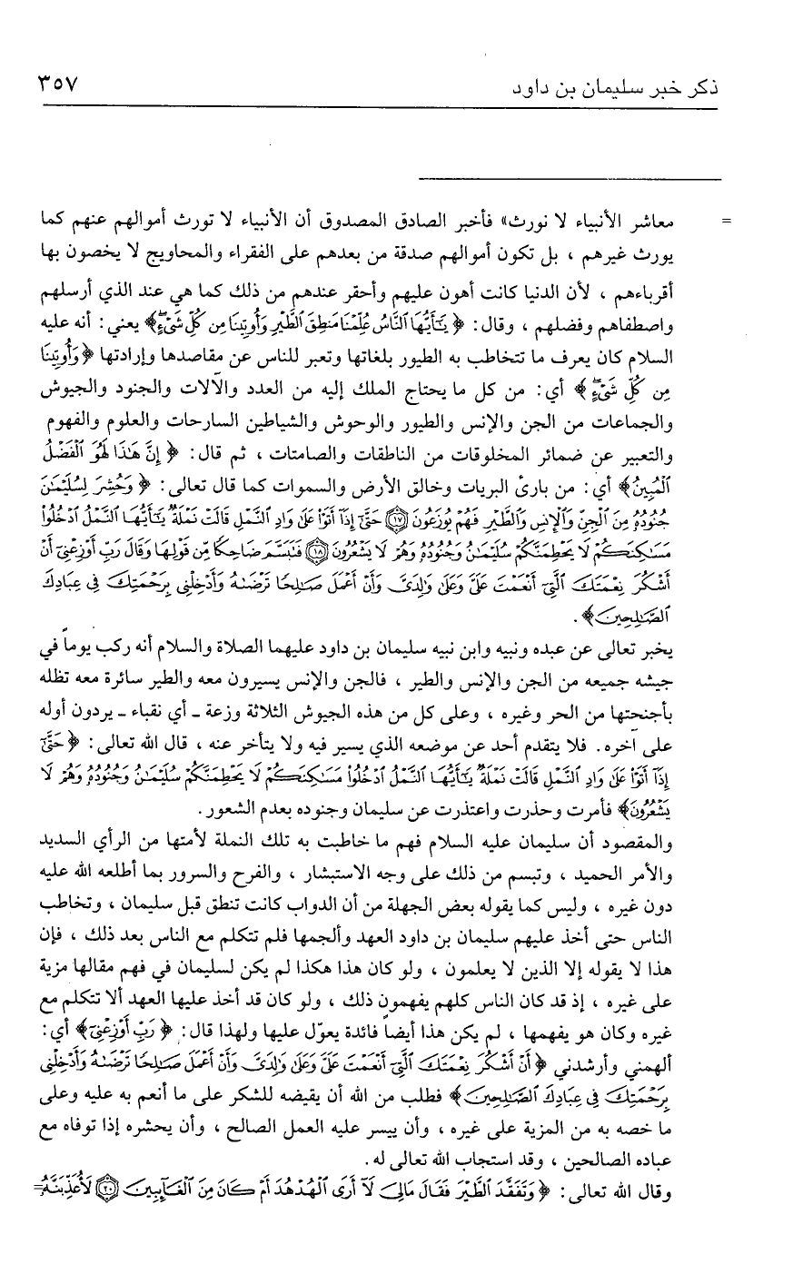 = معاشر الأنبياء لا نورث" فأخبر الصادق المصدوق أن الأنبياء لا تورث أموالهم عنهم كما يورث غيرهم، بل تكون أموالهم صدقة من بعدهم على الفقراء والمحاويج لا يخصون بها أقرباءهم, لأن الدنيا كانت أهون عليهم وأحقر عندهم من ذلك كما هي عند الذي أرسلهم واصطفاهم وفضلهم، وقال: {يَا أَيُّهَا النَّاسُ عُلِّمْنَا مَنْطِقَ الطَّيرِ وَأُوتِينَا مِنْ كُلِّ شَيءٍ} يعني: أنه عليه السلام كان يعرف ما تتخاطب به الطيور بلغاتها وتعبر للناس عن مقاصدها وإرادتهما {وَأُوتِينَا مِنْ كُلِّ شَيءٍ} أي: من كل ما يحتاج الملك إليه من العدد والآلات والجنود والجيوش والجماعات من الجن والإنس والطيور والوحوش والشياطين السارحات والعلوم والفهوم والتعبير عن ضمائر المخلوقات من الناطقات والصامتات، ثم قال: {إِنَّ هَذَا لَهُوَ الْفَضْلُ الْمُبِينُ} أي: من بارئ البريات وخالق الأرض والسموات كما قال تعالى: {وَحُشِرَ لِسُلَيمَانَ جُنُودُهُ مِنَ الْجِنِّ وَالْإِنْسِ وَالطَّيرِ فَهُمْ يُوزَعُونَ (١٧) حَتَّى إِذَا أَتَوْا عَلَى وَادِ النَّمْلِ قَالتْ نَمْلَةٌ يَا أَيُّهَا النَّمْلُ ادْخُلُوا مَسَاكِنَكُمْ لَا يَحْطِمَنَّكُمْ سُلَيمَانُ وَجُنُودُهُ وَهُمْ لَا يَشْعُرُونَ (١٨) فَتَبَسَّمَ ضَاحِكًا مِنْ قَوْلِهَا وَقَال رَبِّ أَوْزِعْنِي أَنْ أَشْكُرَ نِعْمَتَكَ الَّتِي أَنْعَمْتَ عَلَيَّ وَعَلَى وَالِدَيَّ وَأَنْ أَعْمَلَ صَالِحًا تَرْضَاهُ وَأَدْخِلْنِي بِرَحْمَتِكَ فِي عِبَادِكَ الصَّالِحِينَ}.