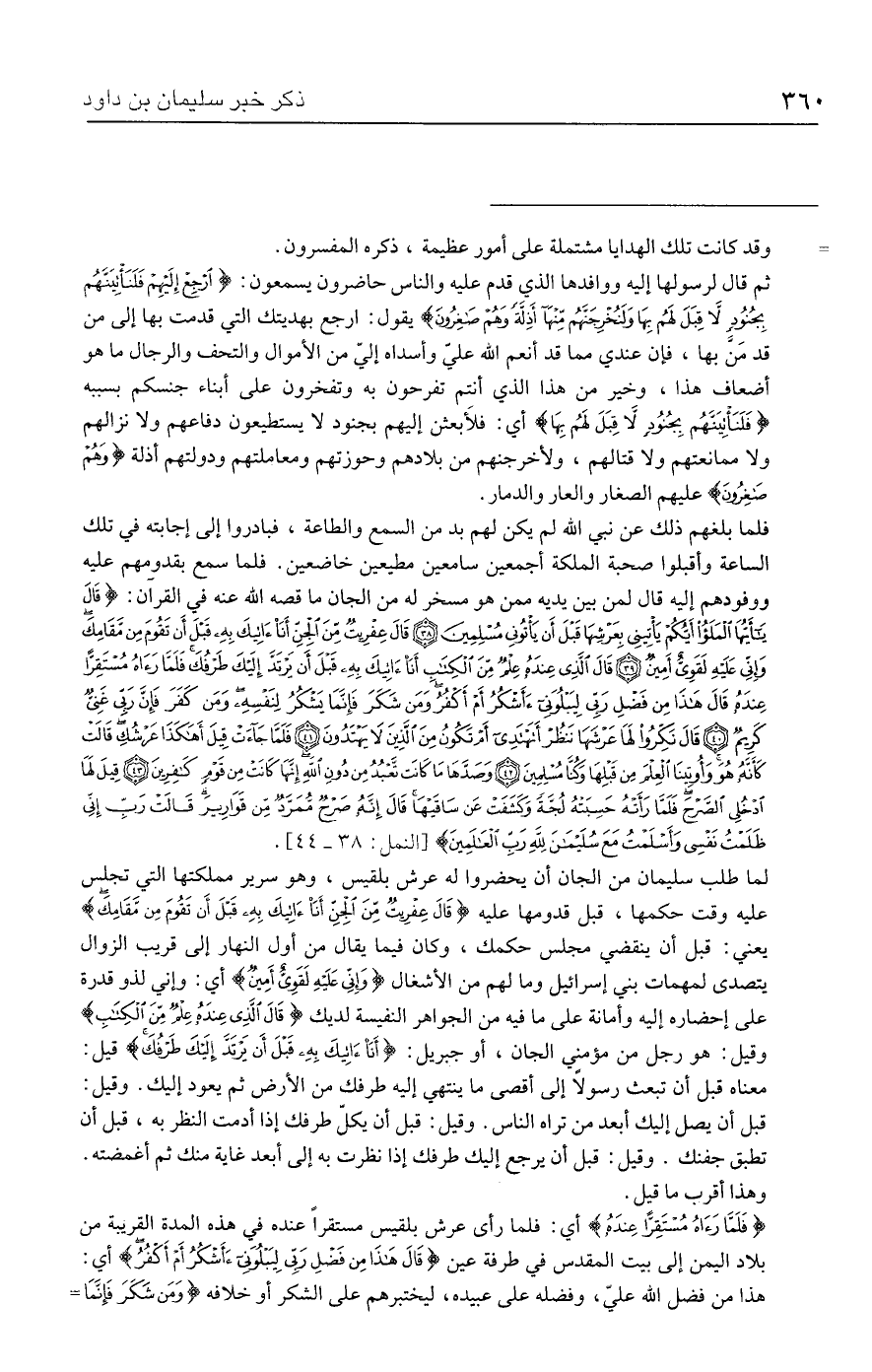 لما طلب سليمان من الجان أن يحضروا له عرش بلقيس، وهو سرير مملكتها التي تجلس عليه وقت حكمها، قبل قدومها عليه {قَال عِفْرِيتٌ مِنَ الْجِنِّ أَنَا آتِيكَ بِهِ قَبْلَ أَنْ تَقُومَ مِنْ مَقَامِكَ} يعني: قبل أن ينقضي مجلس حكمك، وكان فيما يقال من أول النهار إلى قريب الزوال يتصدى لمهمات بني إسرائيل وما لهم من الأشغال {وَإِنِّي عَلَيهِ لَقَويٌّ أَمِينٌ} أي: وإني لذو قدرة على إحضاره إليه وأمانة على ما فيه من الجواهر النفيسة لديك {قَال الَّذِي عِنْدَهُ عِلْمٌ مِنَ الْكِتَابِ} وقيل: هو رجل من مؤمني الجان، أو جبريل: {أَنَا آتِيكَ بِهِ قَبْلَ أَنْ يَرْتَدَّ إِلَيكَ طَرْفُكَ} قيل: معناه قبل أن تبعث رسولًا إلى أقصى ما ينتهي إليه طرفك من الأرض ثم يعود إليك. وقيل: قبل أن يصل إليك أبعد من تراه الناس. وقيل: قبل أن يكلّ طرفك إذا أدمت النظر به، قبل أن تطبق جفنك. وقيل: قبل أن يرجع إليك طرفك إذا نظرت به إلى أبعد غاية منك ثم أغمضته. وهذا أقرب ما قيل.