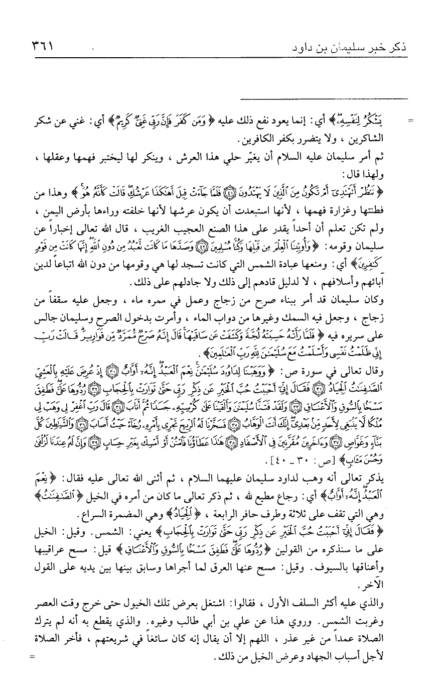 {فَقَال إِنِّي أَحْبَبْتُ حُبَّ الْخَيرِ عَنْ ذِكْرِ رَبِّي حَتَّى تَوَارَتْ بِالْحِجَابِ} يعني: الشمس. وقيل: الخيل على ما سنذكره من القولين {رُدُّوهَا عَلَيَّ فَطَفِقَ مَسْحًا بِالسُّوقِ وَالْأَعْنَاقِ} قيل: مسح عراقيبها وأعناقها بالسيوف. وقيل: مسح عنها العرق لما أجراها وسابق بينها بين يديه على القول اآخر.