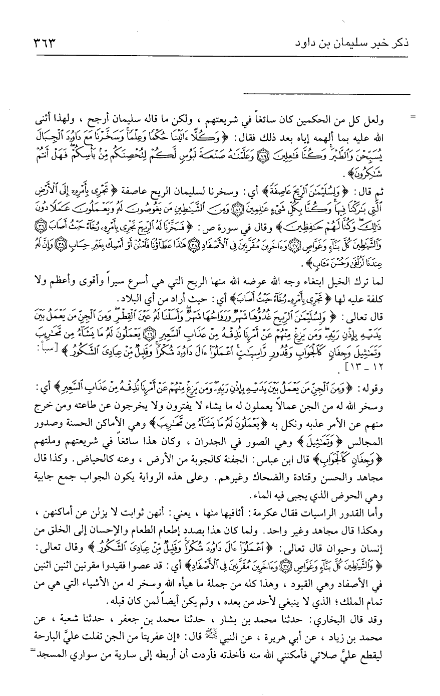 قال تعالى: {وَلِسُلَيمَانَ الرِّيحَ غُدُوُّهَا شَهْرٌ وَرَوَاحُهَا شَهْرٌ وَأَسَلْنَا لَهُ عَينَ الْقِطْرِ وَمِنَ الْجِنِّ مَنْ يَعْمَلُ بَينَ