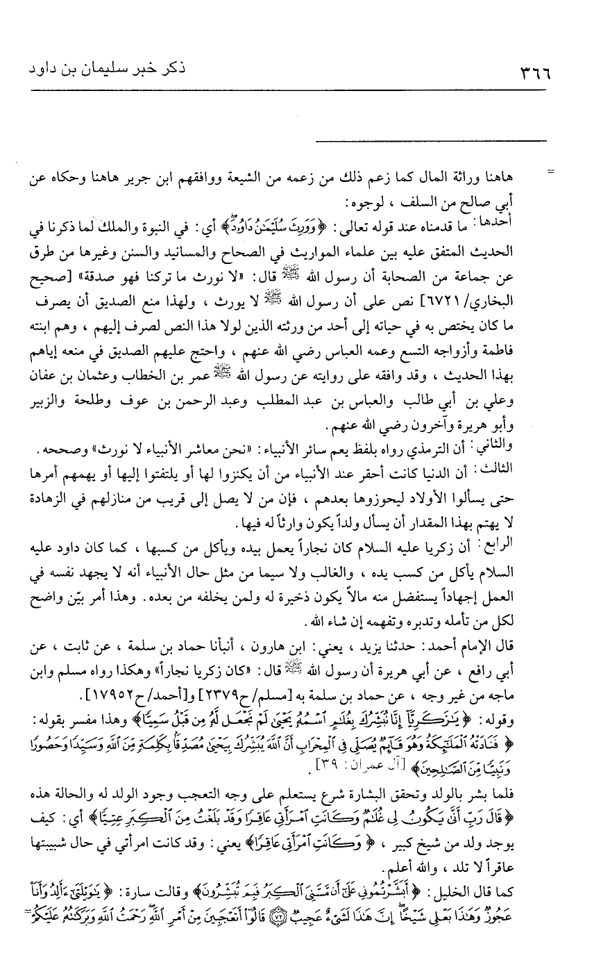 أحدها: ما قدمناه عند قوله تعالى: {وَوَرِثَ سُلَيمَانُ دَاوُودَ} أي: في النبوة والملك لما ذكرنا في الحديث المتفق عليه بين علماء المواريث في الصحاح والمسانيد والسنن وغيرها من طرق عن جماعة من الصحابة أن رسول الله - صلى الله عليه وسلم - قال: "لا نورث ما تركنا فهو صدقة" [صحيح البخاري / ٦٧٢١] نص على أن رسول الله - صلى الله عليه وسلم - لا يورث، ولهذا منع الصديق أن يصرف ما كان يختص به في حياته إلى أحد من ورثته الذين لولا هذا النص لصرف إليهم، وهم ابنته فاطمة وأزواجه التسع وعمه العباس -رضي الله عنهم-، واحتج عليهم الصديق في منعه إياهم بهذا الحديث، وقد وافقه على روايته عن رسول الله - صلى الله عليه وسلم - عمر بن الخطاب وعثمان بن عفان وعلي بن أبي طالب والعباس بن عبد المطلب وعبد الرحمن بن عوف وطلحة والزبير وأبو هريرة وآخرون - رضي الله عنهم -.