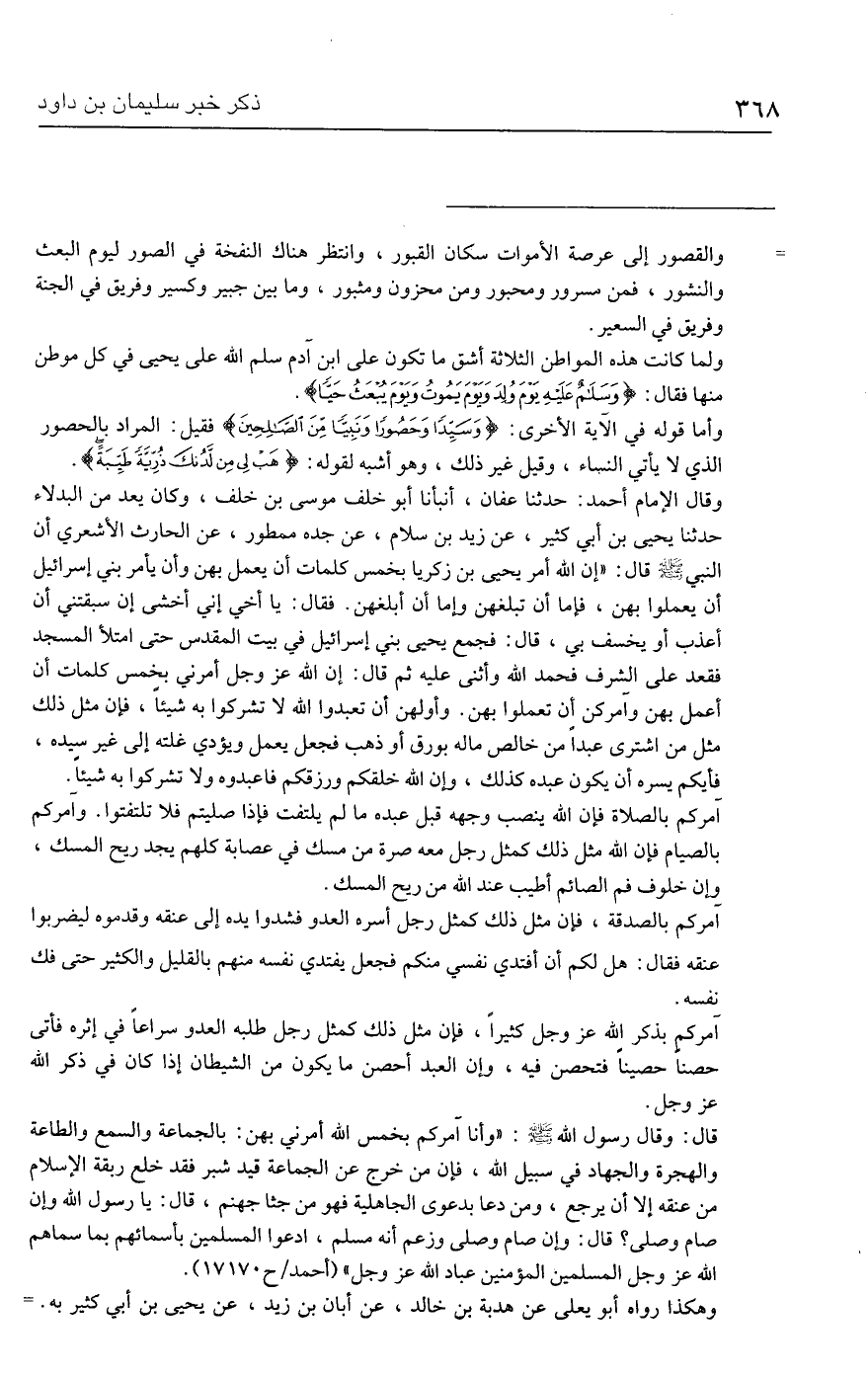 وقال الإمام أحمد: حدثنا عفان، أنبأنا أبو خلف موسى بن خلف، وكان يعد من البدلاء حدثنا يحيى بن أبي كثير، عن زيد بن سلام، عن جده ممطور، عن الحارث الأشعري أن النبي - صلى الله عليه وسلم - قال: "إن الله أمر يحيى بن زكريا بخمس كلمات أن يعمل بهن وأن يأمر بني إسرائيل أن يعملوا بهن، فإما أن تبلغهن وإما أن أبلغهن. فقال: يا أخي إني أخشى إن سبقتني أن أعذب أو يخسف بي، قال: فجمع يحيى بني إسرائيل في بيت المقدس حتى امتلأ المسجد فقعد على الشرف فحمد الله وأثنى عليه ثم قال: إن الله عزَّ وجلَّ أمرني بخمس كلمات أن أعمل بهن وآمركن أن تعملوا بهن. وأولهن أن تعبدوا الله لا تشركوا به شيئًا، فإن مثل ذلك مثل من اشترى عبدًا من خالص ماله بورق أو ذهب فجعل يعمل ويؤدي غلته إلى غير سيده، فأيكم يسره أن يكون عبده كذلك، وإن الله خلقكم ورزقكم فاعبدوه ولا تشركوا به شيئًا. آمركم بالصلاة فإن الله ينصب وجهه قبل عبده ما لم يلتفت فإذا صليتم فلا تلتفتوا. وآمركم بالصيام فإن الله مثل ذلك كمثل رجل معه صرة من مسك في عصابة كلهم يجد ريح المسك، وإن خلوف فم الصائم أطيب عند الله من ريح المسك.