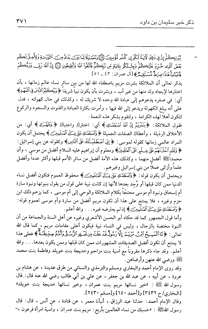وقد روى الإمام أحمد والبخاري ومسلم والترمذي والنسائي من طرق عديدة، عن هشام بن عروة، عن أبيه، عن عبد الله بن جعفر، عن علي بن أبي طالب - رضي الله عنه - قال: قال رسول الله - صلى الله عليه وسلم -: "خير نسائها مريم بنت عمران، وخير نسائها خديجة بنت خويلد" [البخاري / ح ٣٤٣٢] و [أحمد ٦٤٠] و [مسلم ٢٤٣٠].