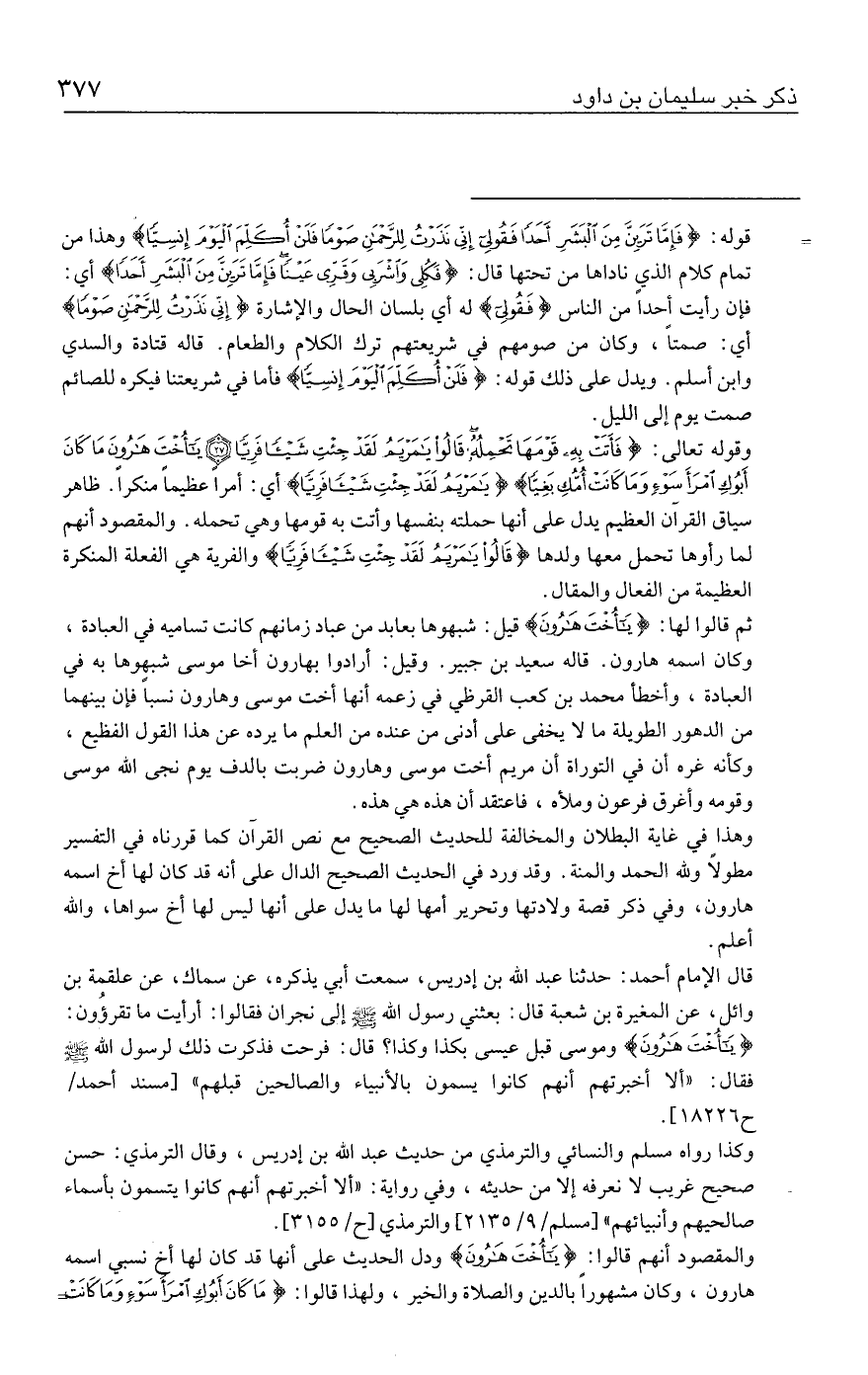 والمقصود أنهم قالوا: {يَاأُخْتَ هَارُونَ} ودل الحديث على أنها قد كان لها أخ نسبي اسمه هارون، وكان مشهورًا بالدين والصلاة والخير، ولهذا قالوا: {مَا كَانَ أَبُوكِ امْرَأَ سَوْءٍ وَمَا كَانَتْ =