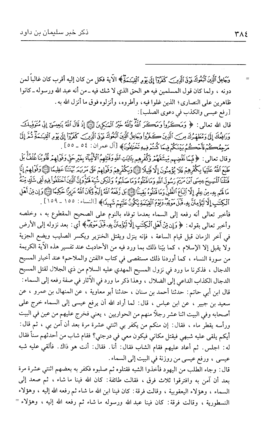 فأخبر تعالى أنه رفعه إلى السماء بعد ما توفاه بالنوم على الصحيح المقطوع به، وخلصه وأخبر تعالى بقوله: {وَإِنْ مِنْ أَهْلِ الْكِتَابِ إلا لَيُؤْمِنَنَّ بِهِ قَبْلَ مَوْتِهِ} أي: بعد نزوله إلى الأرض في آخر الزمان قبل قيام الساعة، فإنه ينزل ويقتل الخنزير ويكسر الصليب ويضع الجزية ولا يقبل إلا الإسلام، كما بينا ذلك بما ورد فيه من الأحاديث عند تفسير هذه الآية الكريمة من سورة النساء، كما أوردنا ذلك مستقصى في كتاب "الفتن والملاحم" عند أخبار المسيح الدجال، فذكرنا ما ورد في نزول المسيح المهدي - عليه السلام - من ذي الجلال لقتل المسيح الدجال الكذاب الداعي إلى الضلال، وهذا ذكر ما ورد في الآثار في صفة رفعه إلى السماء: قال ابن أبي حاتم: حدثنا أحمد بن سنان، حدثنا أبو معاوية، عن المنهال بن عمرو، عن سعيد بن جبير، عن ابن عباس، قال: لما أراد الله أن يرفع عيسى إلى السماء خرج على أصحابه وفي البيت اثنا عشر رجلًا منهم من الحواريين، يعني فخرج عليهم من عين في البيت ورأسه يقطر ماء، فقال: إن منكم من يكفر بي اثنتي عشرة مرة بعد أن آمن بي، ثم قال: أيكم يلقى عليه شبهي فيقتل مكاني فيكون معي في درجتي؟ فقام شاب من أحدثهم سنًّا فقال له: اجلس. ثم أعاد عليهم فقام الشاب فقال: أنا. فقال: أنت هو ذاك. فألقي عليه شبه عيسى، ورفع عيسى من روزنة في البيت إلى السماء.