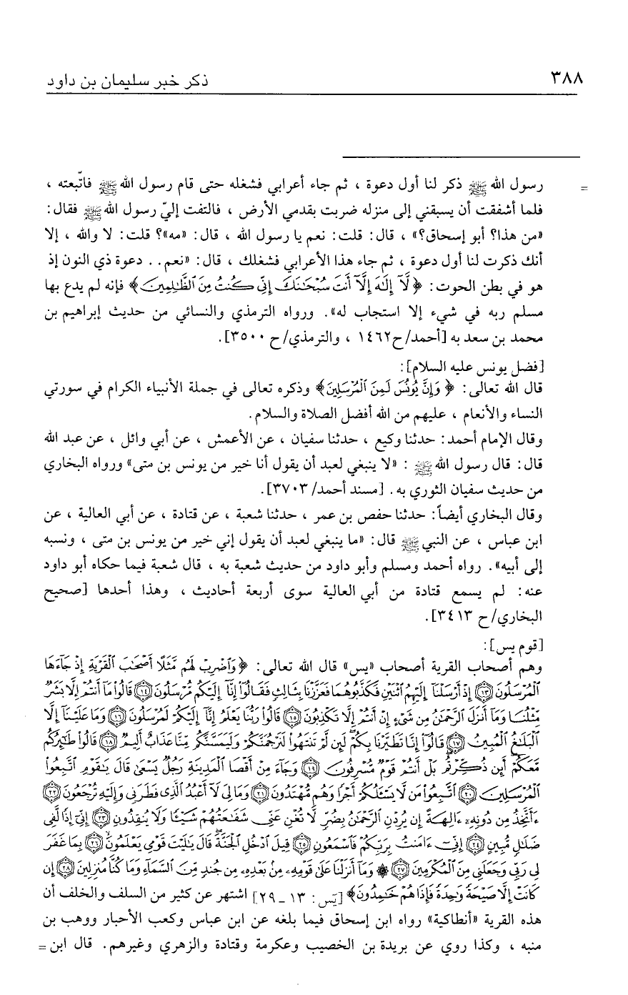 قال الله تعالى: {وَإِنَّ يُونُسَ لَمِنَ الْمُرْسَلِينَ} وذكره تعالى في جملة الأنبياء الكرام في سورتي النساء والأنعام، عليهم من الله أفضل الصلاة والسلام.